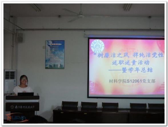 6月5日晚,材料学院2012级研究生1党支部在将军路校区材料楼举办了“树廉洁之风,捍纯洁党性——提升研究生党员政治素养”述职述责活动。活动由支部书记马遗萍主持,全体支部党员和积极分子以及兄弟支部的支委会成员参加了本次活动。活动中积极分子和正式党员分别从“为什么”和“怎么样”两方面阐述了研究生党员对纯洁性的看法,并针对本学年“反腐倡廉漫画展”、“党员入党后再教育”、“反腐倡廉,以案说法”等系列活动进行总结反思,对支部的发展提出了合理建议。