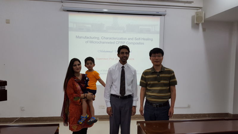 Umar 的博士研究课题是“具有微通道的碳纤维增强复合材料的制造、表征和自愈合”。经过两年多艰辛的探索,他开创性地提出了两种在碳纤维增强复合材料内部制造微通道的方法,这些技术不仅解决了许多与微通道相关的技术难题,而且推广了微通道复合材料在微型反应器领域的应用,并对航空飞行器的减重有重要价值。通过对这些微通道复合材料进行表征,他还获得了一系列新的发现,进一步完善了成型机理和复合材料损伤模型。作为这几年来的研究成果,Umar 一共在国际SCI杂志上发表了8篇SCI论文,已出版6篇SCI论文,此外还有3篇EI论文和3篇国际大会论文,取得了突出的学术成果。在博士毕业答辩过程中,答辩老师们对Umar 的研究工作和学术成果给予了高度赞赏和表扬,一致同意推荐其为优秀论文。