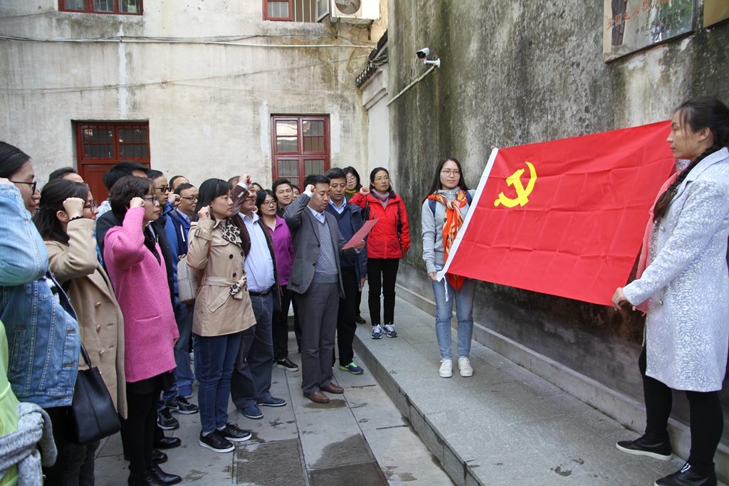在江苏省爱国主义教育基地、党史教育基地——新四军一支队司令部旧址,所有学院领导干部和教职工详细了解了新四军星火燎原、发展壮大、英勇抗日的战绩,重温了中国共产党领导抗日战争的光辉曲折历程。深受革命先烈的英勇事迹感染和启发,所有党员教职工举起右拳,庄严宣誓,重温入党誓词,表达坚定的共产主义理想信念和为党的教育事业奋斗终身的坚定意志,争做“心中有党、心中有民、心中有责、心中有戒”的“四有干部”和“有理想信念、有道德情操、有扎实知识、有仁爱之心”的“四有教师”。一些非党员教师目睹宣誓场景也深受感染,表示尽快向党组织靠拢。