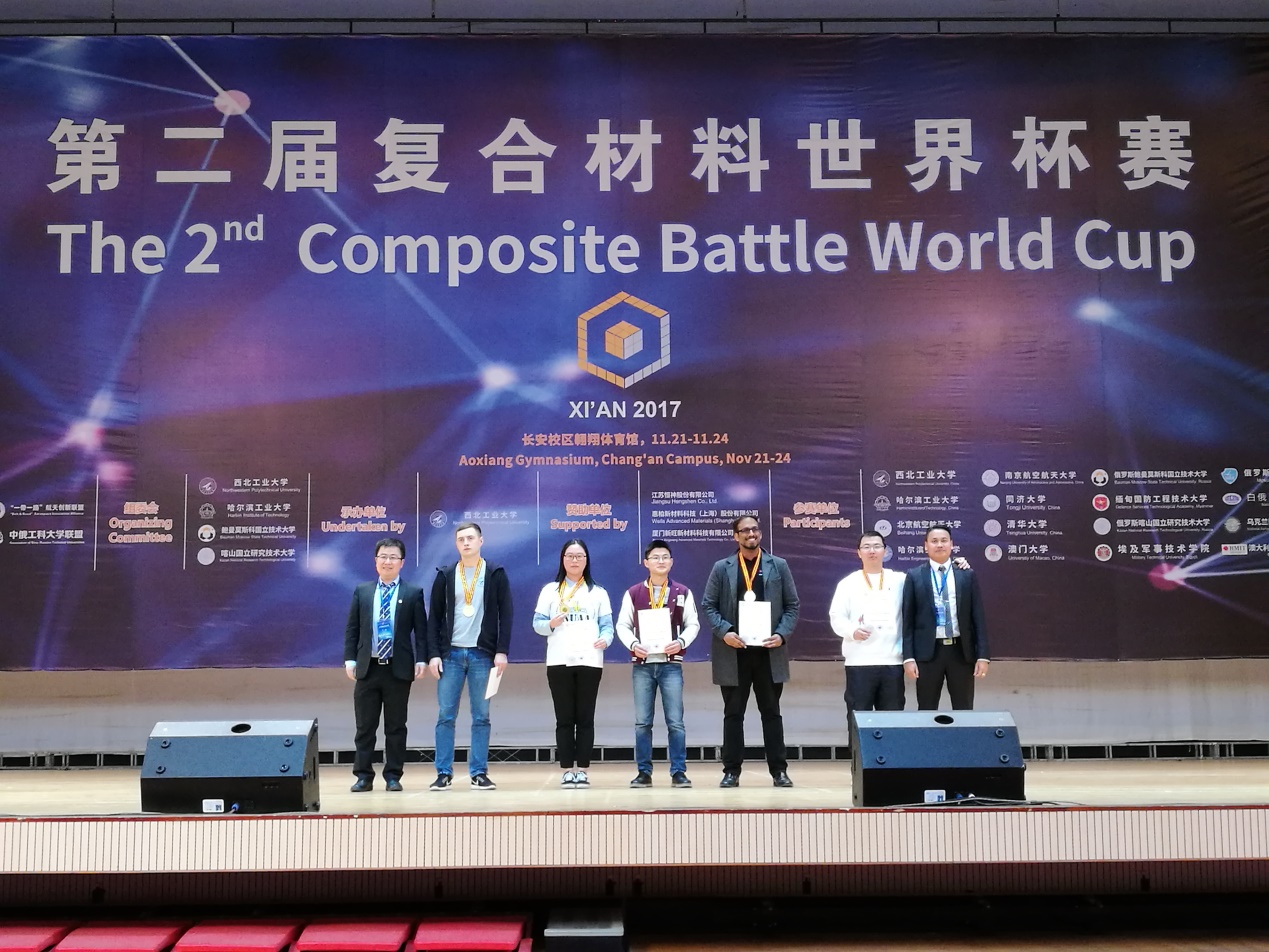 2017年11月20-24日,第二届复合材料世界杯赛开幕式在西北工业大学长安校区翱翔体育馆举行。由我校国际合作交流处组织,材料学院2016、2014级研究生以及指导老师姚正军教授、顾冬冬教授和周金堂老师组成的NUAA.VARIer参赛团队参加了比赛并获得优异成绩。