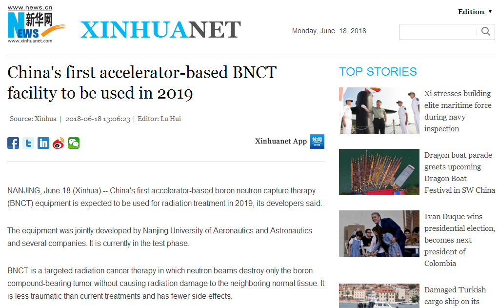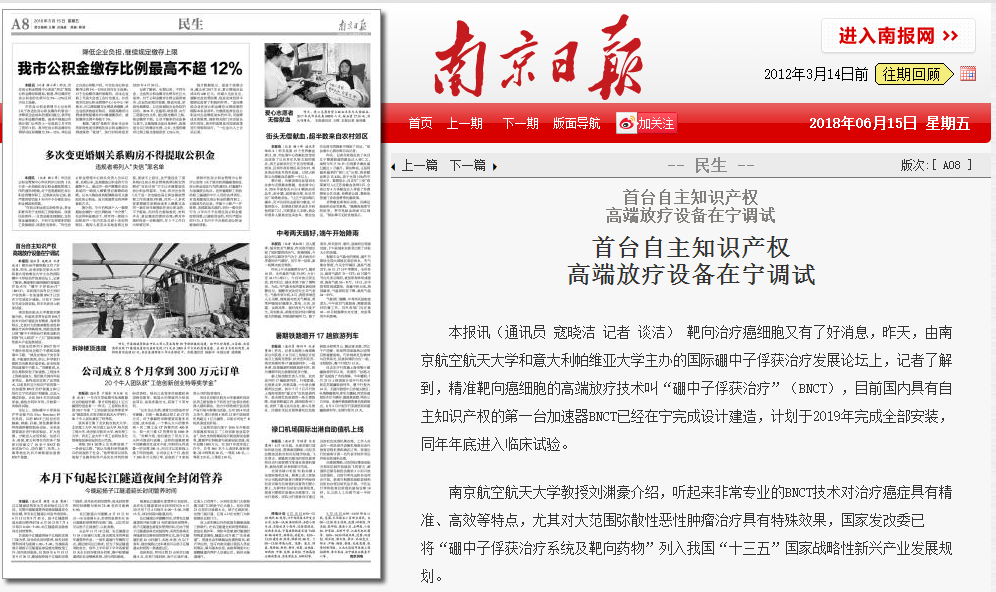 6月14日,由南京航空航天大学和意大利帕维亚大学联合主办的2018国际硼中子俘获治疗发展论坛在南京开幕。我校电子游戏试玩 核科学与工程系汤晓斌教授与江苏省产业教授、南京中硼联康医疗有限公司首席科学家刘渊豪教授共同担任本次论坛主席。记者从会上了解到,目前,由南京航空航天大学、南京中硼联康医疗科技有限公司等单位联合开发的,具有自主知识产权的国内第一台加速器BNCT治疗装置主体已经完成设计和建造,进入调试阶段,并计划于2019年完成全部安装。