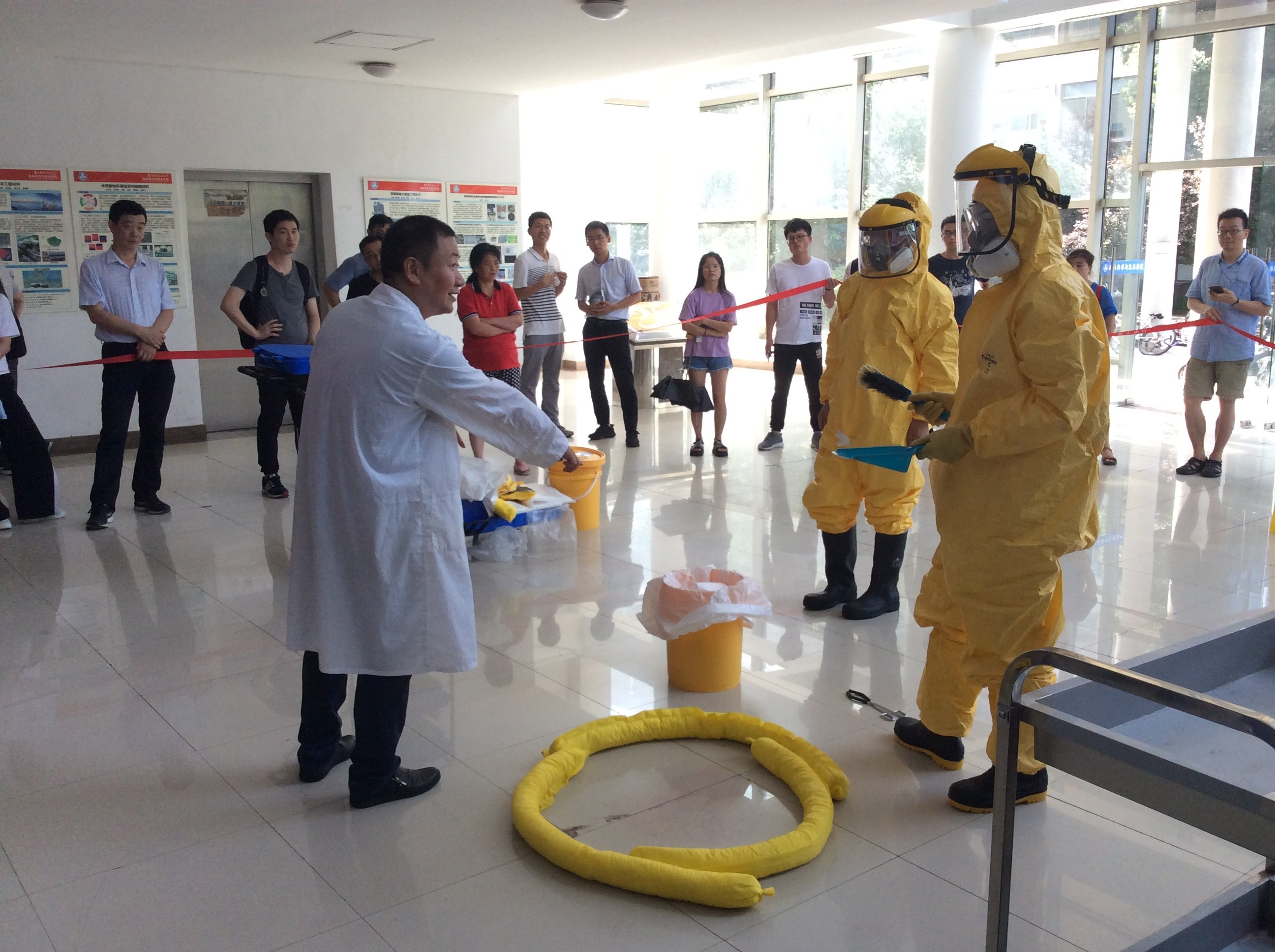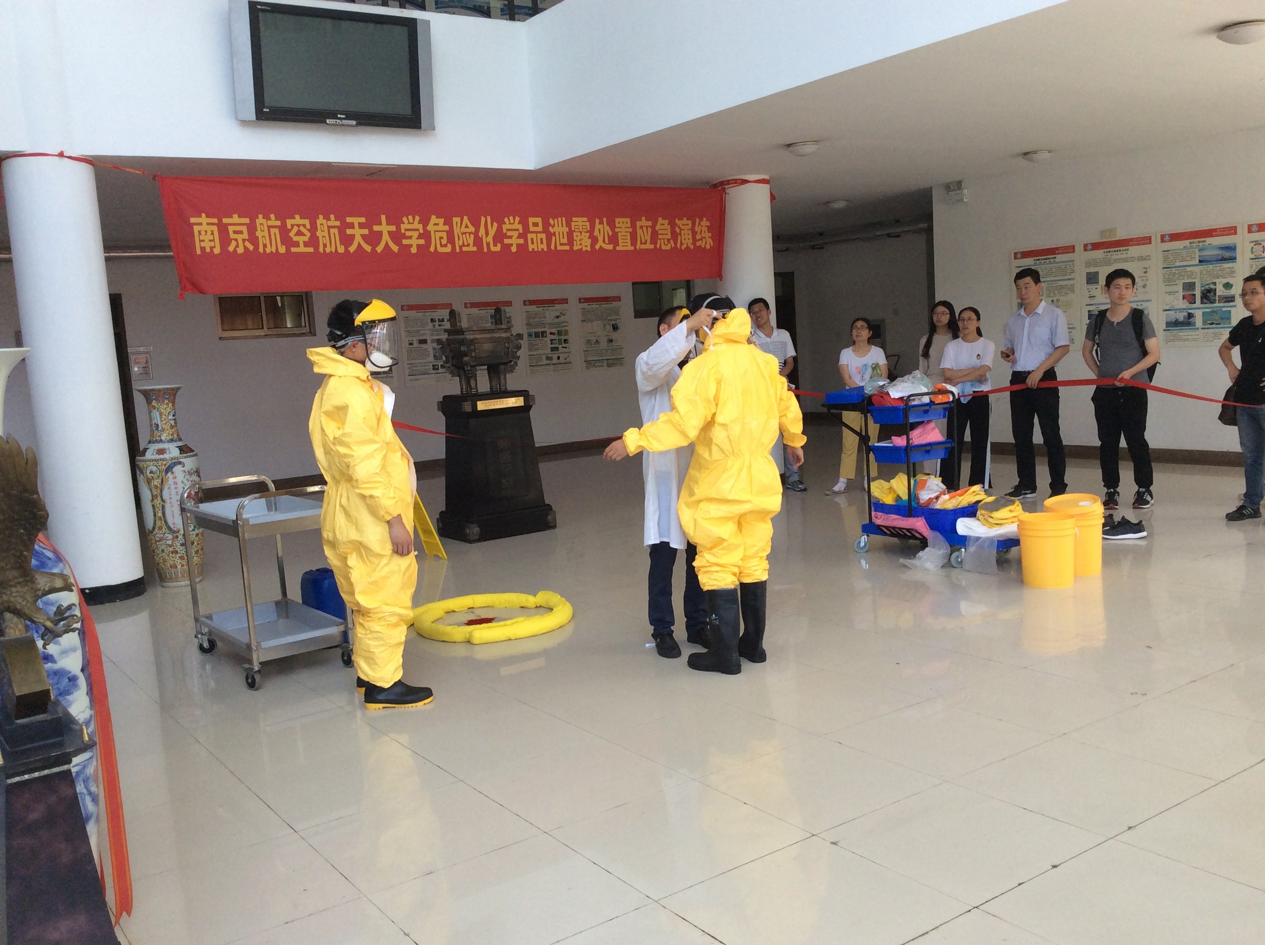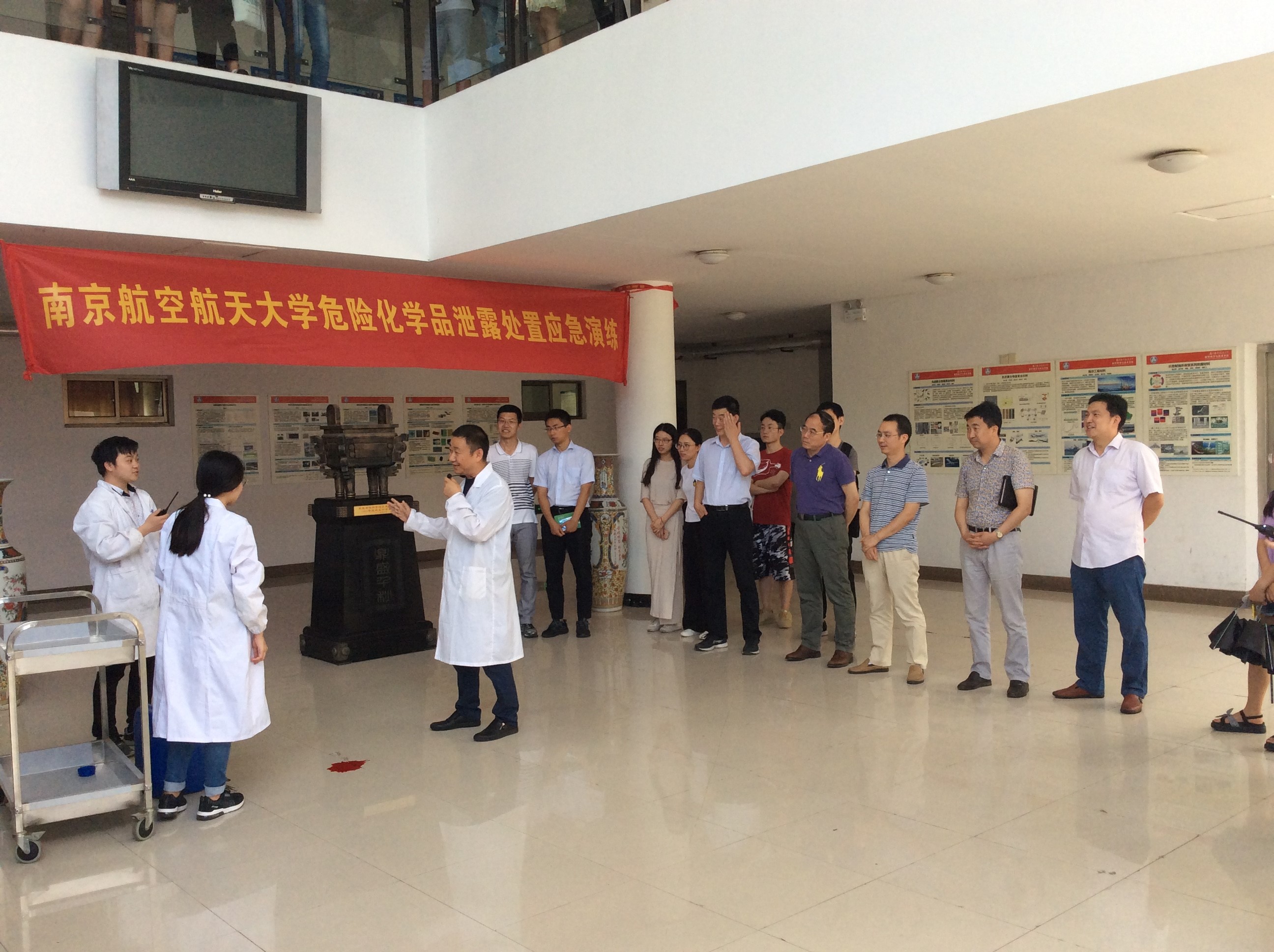 为贯彻落实教育部办公厅《关于开展教育系统2018年“安全生产月”和“安全生产万里行”活动的通知》,为提高广大师生应对危险化学品安全使用认识和危险化学品突发事故的应急处置能力,2018年6月26日下午,由国有资产管理处、电子游戏试玩 联合举办,赛弗安全全程助力的“南京航空航天大学大学危化品泄漏应急演练”在将军路校区电子游戏试玩 举行。电子游戏试玩 、航空宇航学院、能源与动力学院、机电学院、航天学院、物资供应中心等涉及危险化学品使用的单位组织相关教职工和学生代表约100人参加了本次培训。电子游戏试玩 党委书记孙占久、院长姚正军、副院长汤晓斌、院长处理陶海军,国有资产管理处副处长阎志军出席了培训会。