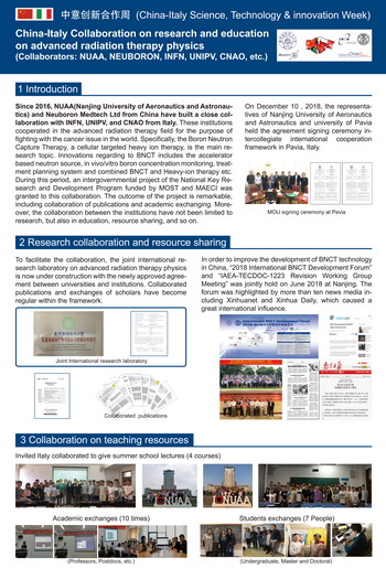 电子游戏试玩 汤晓斌教授课题组从2015年起与意大利国家核物理研究院、意大利帕维亚大学开展科学研究、人才培养方面的国际合作。2016年,联合意大利合作单位申报获批了国家重点研发计划政府间国际科技创新合作重点专项——加速器硼中子俘获癌症治疗超热中子束设计与剂量优化。该项目多次得到中意两国外交、科技部门的关注,寄希望该项目成果能成为“一带一路”计划中意合作的实质性标志成果。由电子游戏试玩 牵头,2018年12月我校与意大利帕维亚大学签署了校际合作框架协议;2019年10月又签署了两校共同成立“先进放射治疗物理国际合作联合实验室”协议。截止到今年下半年,中意双方互派本科生、硕士生和博士生交流联培共20余人次;科研人员联合发表学术论文33篇;共同举办了2018国际硼中子俘获治疗发展论坛;意大利帕维亚大学知名教授来校开设国际暑期课程4门。通过与意大利各科研机构的国际学术交流与合作,有利推动了我校核科学与技术学科的发展,实现了人才培养和科学研究的双赢,期待这些合作成果能成为我校国际化建设的标志性成果。