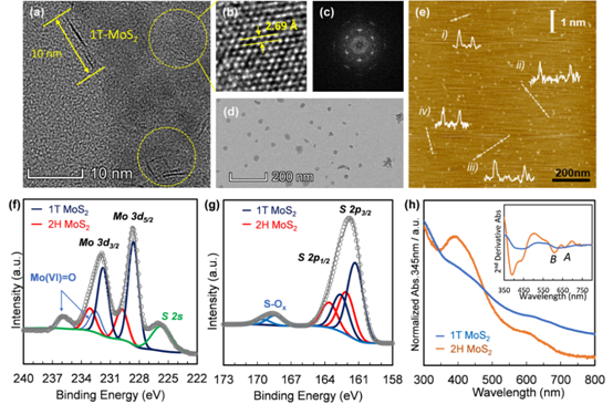 图1:纳米单层1T-MoS2的 (a-d) 高分辨透射电子显微图像和 (e) 原子力显微图像;1T-MoS2和2H-MoS2的 (f) Mo 3d和(g)S 2p的XPS谱图比较;(h)UV-vis谱