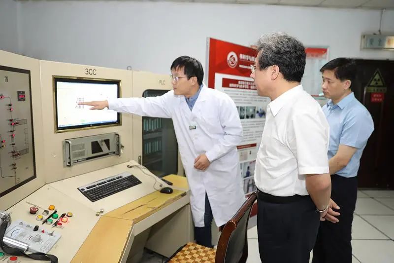 在南京航空航天大学的辐照实验中心,中心副主任龚频向考察组领导介绍了中心的基本情况。王天琦详细了解伽玛辐照装置的生产运行过程,对安全联锁措施进行查验,并进入辐照室察看放射源的水下安全存储情况。学院副院长汤晓斌代表学院向王天琦等省领导汇报了我校核学科的学科发展情况,以及近年来与省生态环境部门、单位开展科研合作的情况。王天琦叮嘱辐照实验中心相关责任人,一定要履行安全主体责任,切实强化日常安全管理,确保辐射安全万无一失;要发挥学校科研优势,加快核技术研究成果的应用转化,在安全利用的前提下,服务发展,造福百姓。