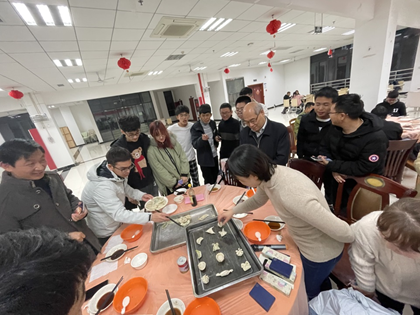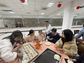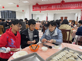 食堂的师傅们提前为师生们准备好了韭菜鸡蛋馅、玉米猪肉馅、白菜猪肉馅等丰富多样的馅料。各位领导走到学生中间,挽起袖子和大家一起动手,来自五湖四海的老师同学们相互交流学习包饺子的经验和手艺。