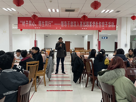 活动伊始,黄志球表示很高兴与材料学院的学生对接联系,也非常高兴参加今天的包饺子活动,他代表学校表达了对同学们的关心,希望通过这个平台走近学生、加强交流。随后,作为材料学院的资深院友,曹福春从“学长”的角度对同学们提出了殷切的期盼。材料学院的几位大家长也一一上台,从学院层面表示了对同学们的切实关注。