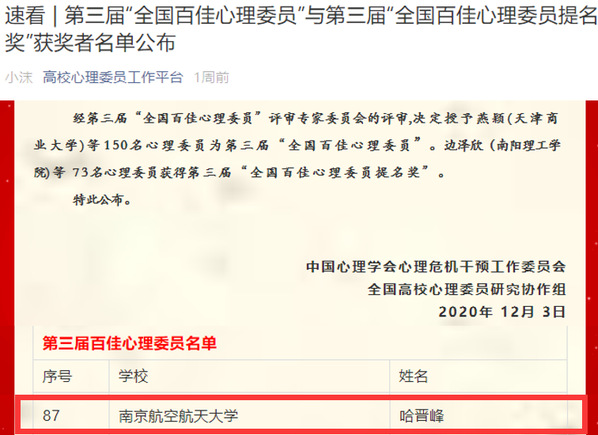 2020年是全国高校心理委员工作研讨会暨朋辈心理辅导论坛举办的第十五年。11月23日上午,第十五届全国高校心理委员工作研讨会暨朋辈心理辅导论坛以线上直播的形式正式拉开帷幕。经过全校综合选拔,示推荐了电子游戏试玩 的哈晋峰、电子信息工程学院的罗岚、民航/飞行学院的张晨阳、同学参与全国百佳心理委员的评选。最终,哈晋峰从全国248名参赛者中脱颖而出,荣获“第三届全国百佳心理委员”称号,罗岚,张晨阳同学荣获“第三届全国百佳心理委员提名奖”。