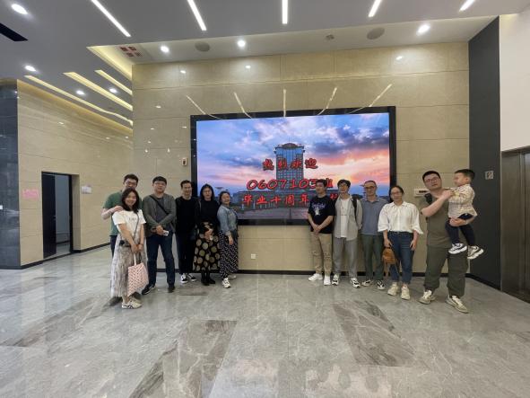 在久别叙旧、畅聊往事后,大家一起点蜡烛分蛋糕,庆祝毕业十周年后能再次与旧时的同窗在母校重聚,重拾当年的欢乐点滴。他们感叹学校、学院发展之迅猛,为新院楼的建成表示由衷地开心,希望学院能够越办越好。