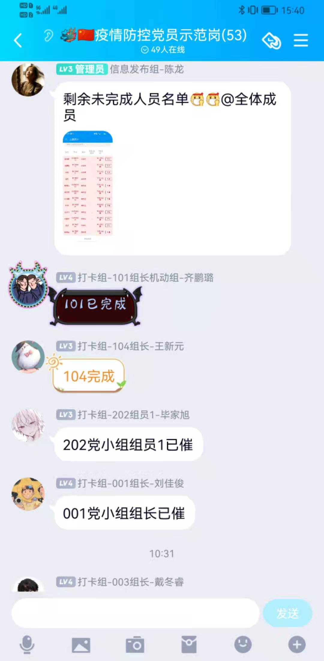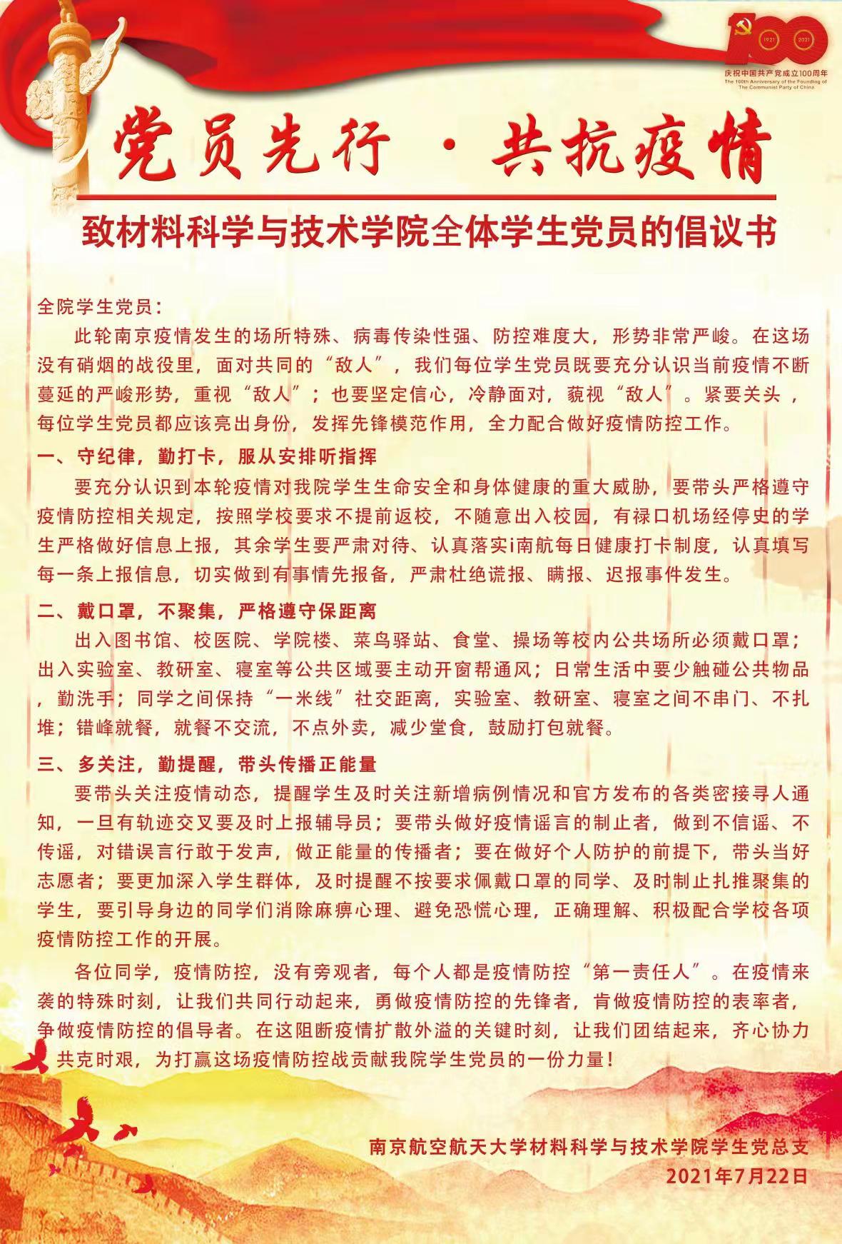 7月20日南京暴发疫情以来,电子游戏试玩 师生积极投身到疫情防控工作中来,“材料楼复材实验室已全面消杀”、“研究生一支部所有成员已完成打卡”、“2020级全体学生已完成打卡”、“‘涝疫’期间每日数据已更新”、“我已于今天解除隔离,请老师放心”、“值班巡楼已完成,安全”……每天上午11点,电子游戏试玩 各防疫工作群里消息不断,全院师生积极投身到疫情防控工作中,他们用行动传递了疫情中的爱与温暖,让我们看到了一幕幕感人的画面。