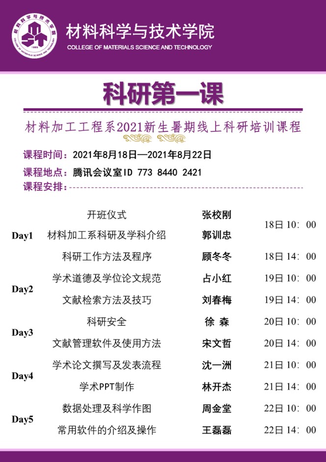 疫情当前,在这个特殊的暑假,材料加工工程系对2021级研究生主动关怀,积极组织了包括材料加工工程系科研成果简介、科研工作方法及程序、研究生培养及学术规范、实验安全知识、文献检索方法及技巧、文献管理软件及方法、文献阅读与论文写作/投稿等丰富的暑期课程,为提升材料学院新生的科研素养提供了丰富的资源,共计200多名学生参与了此次课程学习。