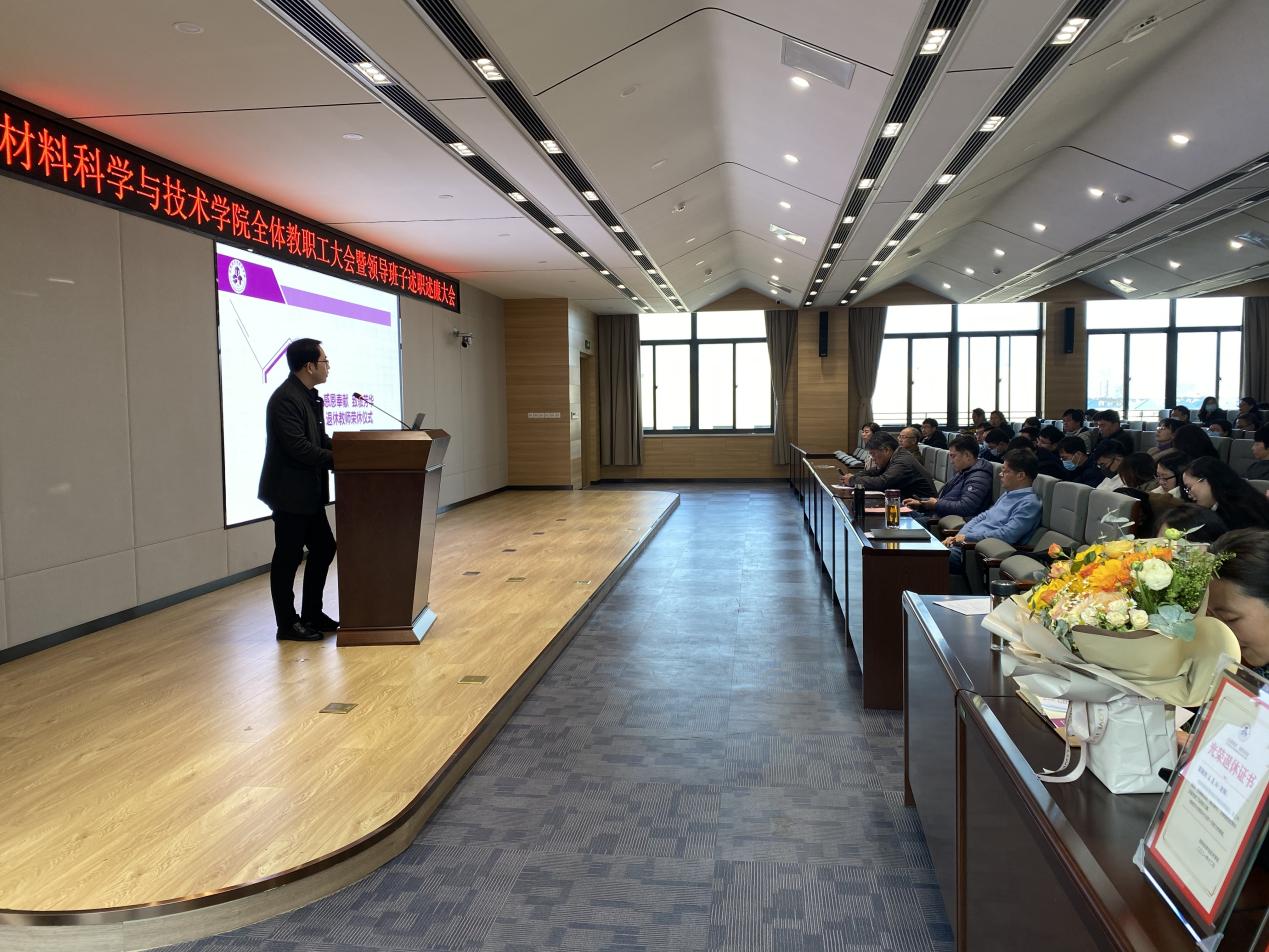 学院院长张校刚代表学院领导班子作2021年度领导班子工作总结,就学院学科建设、师资队伍建设、人才培养、科学研究、国际合作工作取得的成效进行汇报。他强调,本年度全体师生齐心战疫、奋力突破、共谋发展、逆境前行,学院在人才培养、人才引进、教学成果、科研奖励、科研经费总量等众多方面实现了历史性的突破,充分展现了“材料人”的担当和奉献精神。