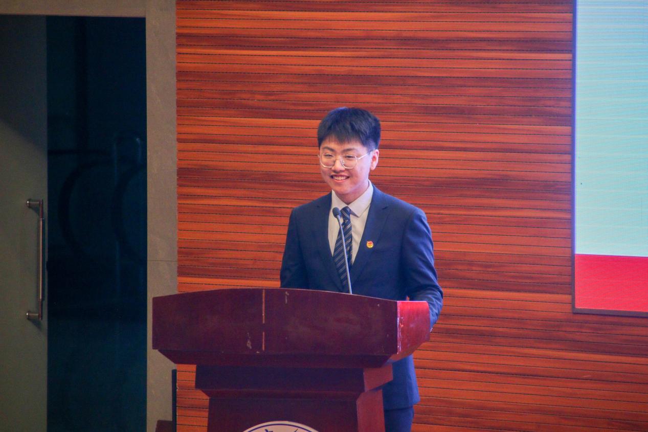 数学学院岳嘉禾作为学员代表发言,他结合自己的成长和学习经历,表达了自己坚定的理想信念,坚定不移听党话、跟党走的决心,“青春心向党,建功新时代”的心声与誓言。