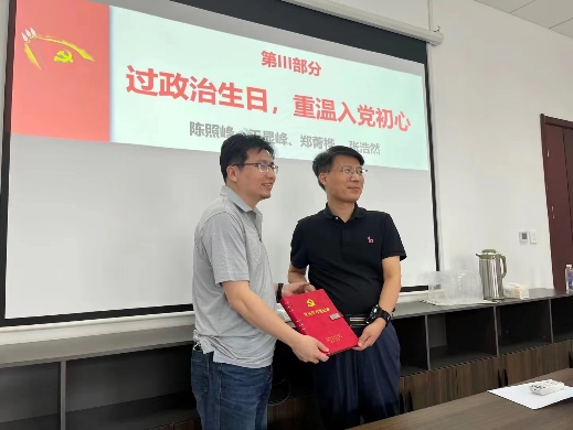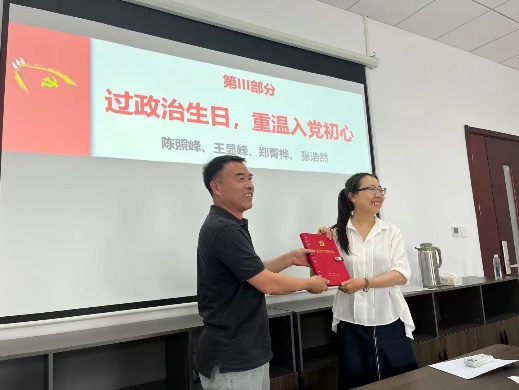最后,支部组织委员林开杰和宣传委员王磊磊老师共同策划开展了《过政治生日,重温入党初心》的主题活动。支部为四位五月份入党的党员定制了个性化的纪念品,并且邀请支部的优秀党员代表送上这份生日礼物。四位党员做了入党初心分享,回顾了成长历程,坚定了“为党育人”的初心使命。与会党员们开展了深入交流研讨,一致认为记住自己的“政治生日”,是对党的热爱与忠诚,要时刻铭记从哪里来、到哪里去、为何出发、如何抵达。这次活动也是支部落实开展学院“凝心赋能”提升治理能力揭榜挂帅项目的重要举措,满载着学院党委及系党支部对党员的关心和希望,进一步引导广大党员强化身份意识、宗旨意识和责任意识,增强支部的号召力,凝聚力、战斗力`。