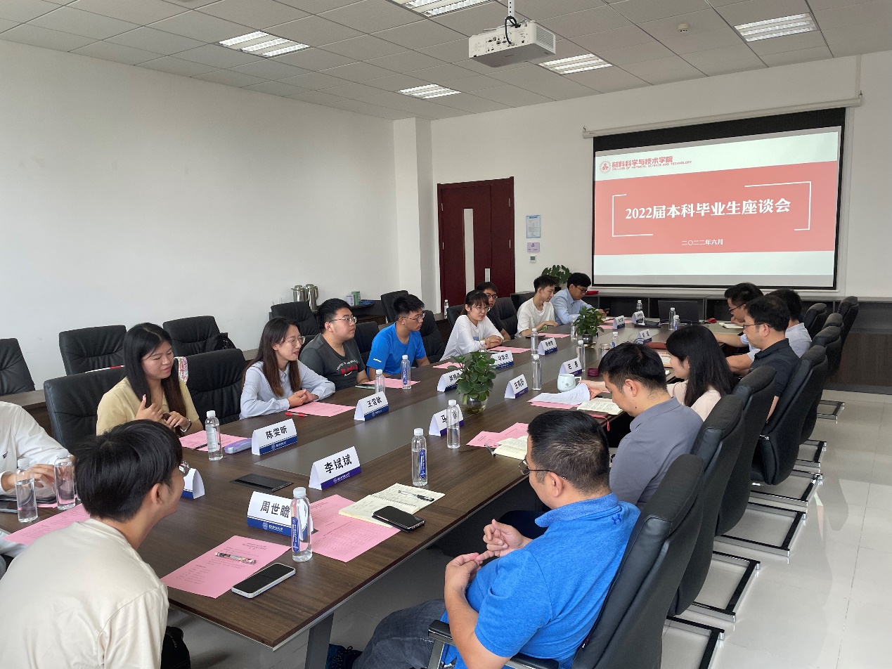 举办2022届本科毕业生座谈会,院党委书记石勇、副院长陶海军、材料科学系主任马骏、应用化学系主任常焜、材料加工工程系副主任李斌斌及11位2022届本科毕业生代表参与本次座谈会,会议由党委副书记庄晓舒主持。