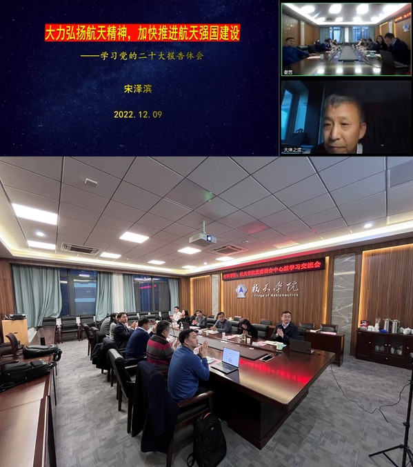 为深入学习贯彻党的二十大精神,大力弘扬航天精神,加快推进航天强国建设,12月9日电子游戏试玩 联合航天学院举行党委理论学习中心组联合学习交流会。学院党委书记石勇,院长张校刚,党委副书记庄晓舒,副院长汤晓斌、陶海军、刘周成,航天学院党委书记孙占久,常务副院长陈金宝,党委副书记林晓,副院长盛庆红、朱旭东、王寅出席会议。会议由孙占久主持。