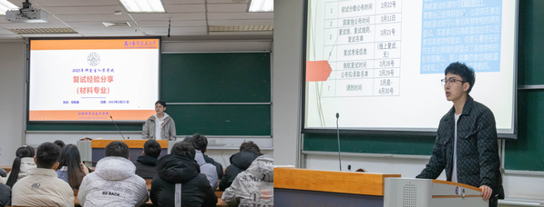 材料科学与工程专业郑乾康紧扣三本材料专业复试用书以及相关课程,从自我介绍、英文翻译、专业问答、自由提问等方面详细介绍了复试流程。材料与化工专业谢世杰向同学们梳理了复试时间轴,并根据自己复试经历介绍面试每一步所需要注意的细节,他还给大家分享了考研调剂的相关经验,希望大家能分清主次、抓住重点、掌握规律。