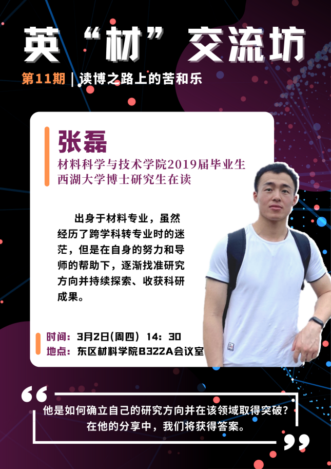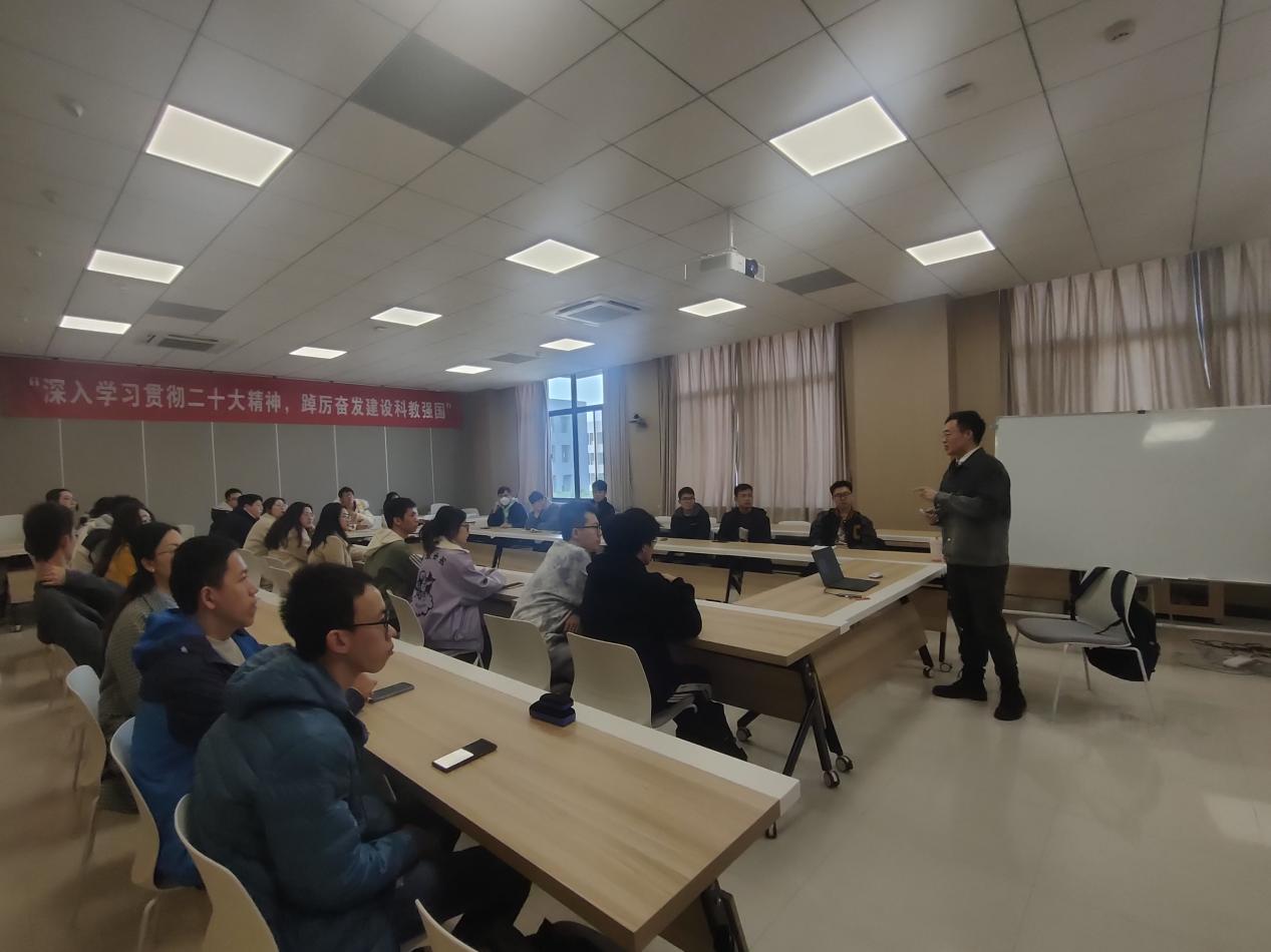 张磊首先分享了自己在南航的难忘记忆,对材料学院老师们的培养表示感谢;随后介绍了在西湖大学的读博经历,作为跨学科转专业学生,他分享了自己转专业时的心路历程,指出读博阶段需要在自己已有知识面的基础上更深入、更有针对性地学习专业知识;最后他就科学研究、合作交流、论文写作等方面分享了自己的经验与感悟。互动环节,同学们踊跃提问,现场气氛热烈,在场同学深受启发。