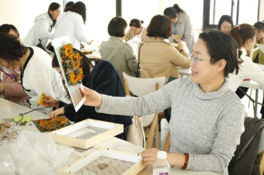 指尖芬芳,花漾人生活动——《梵高的向日葵》干花相框制作环节,花艺指导老师结合实物,为大家详细介绍了花材知识、插花艺术、干花搭配和裁剪、造型设计等插花步骤和技巧,展示了高雅的花艺作品也是创新的成果。老师们结合自身的想象力和创造力,融合自我审美感受,沉浸在创作中。整个过程,大家谈笑风生,互相欣赏,发挥奇思妙想,最终呈现出了一件件寄托对美的理解和感悟的精美作品,充分展示着女性同胞热爱生活、昂扬向上、追求真善美的精神风貌。