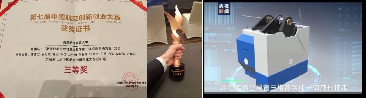 电子游戏试玩 柔性成形技术及装备团队项目《高性能航空导管三维数字化一体成形解决方案》在2022年的复赛中成功脱颖而出,入选全国十五强,同时代表南航参与到这次的全国总决赛中。经过激烈的角逐,电子游戏试玩 柔性成形技术及装备团队荣获第七届中国航空创新创业大赛全国总决赛创新组三等奖,并受到央视新闻的重点报道!