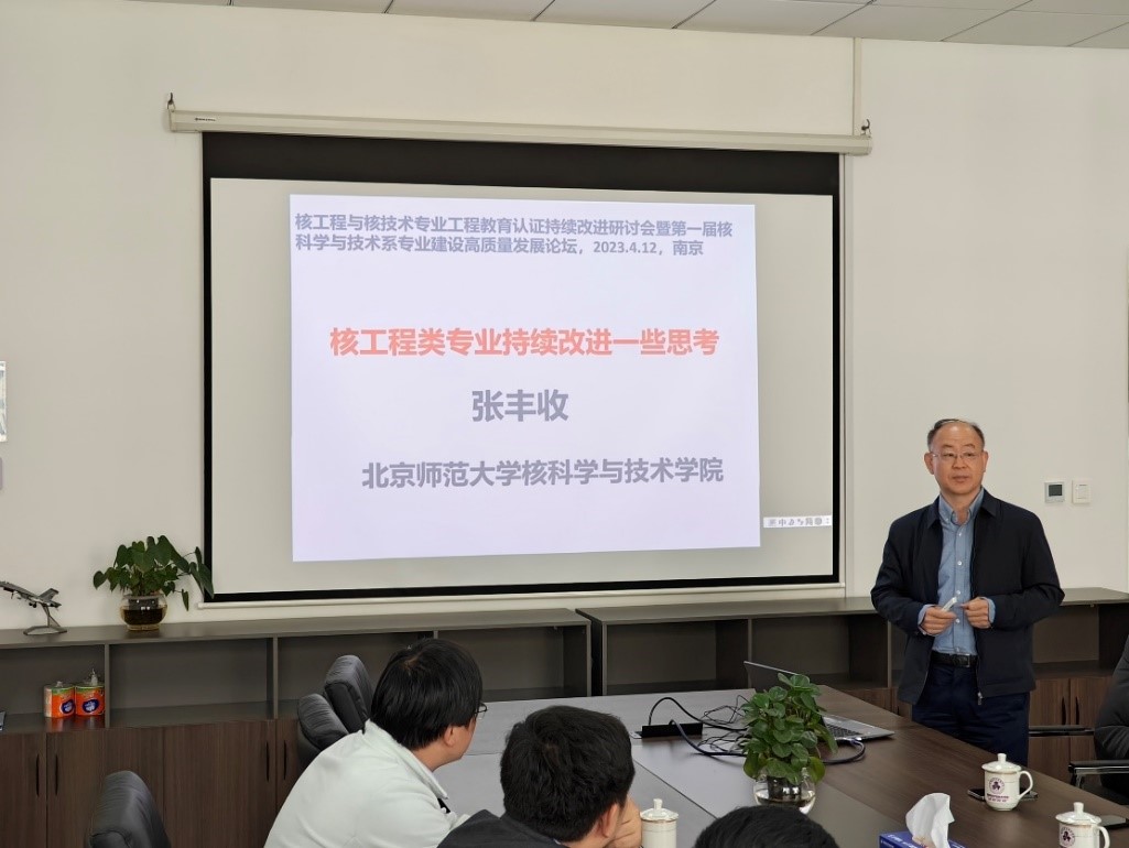 为了推动工程教育认证持续改进工作高质量内涵式发展,促进核工程与核技术专业人才培养质量不断提升,4月12日上午,电子游戏试玩 组织召开核工程与核技术专业工程教育认证持续改进研讨会,邀请教育部高等学校教指委核工程类专业教学指导委员会副秘书长、北京师范大学核科学与技术学院张丰收教授出席会议并作主题报告,会议由副院长陶海军主持,材料加工系副主任李斌斌、核科学与技术系副主任龚频、主任助理何庆华及部分教师代表参加会议。