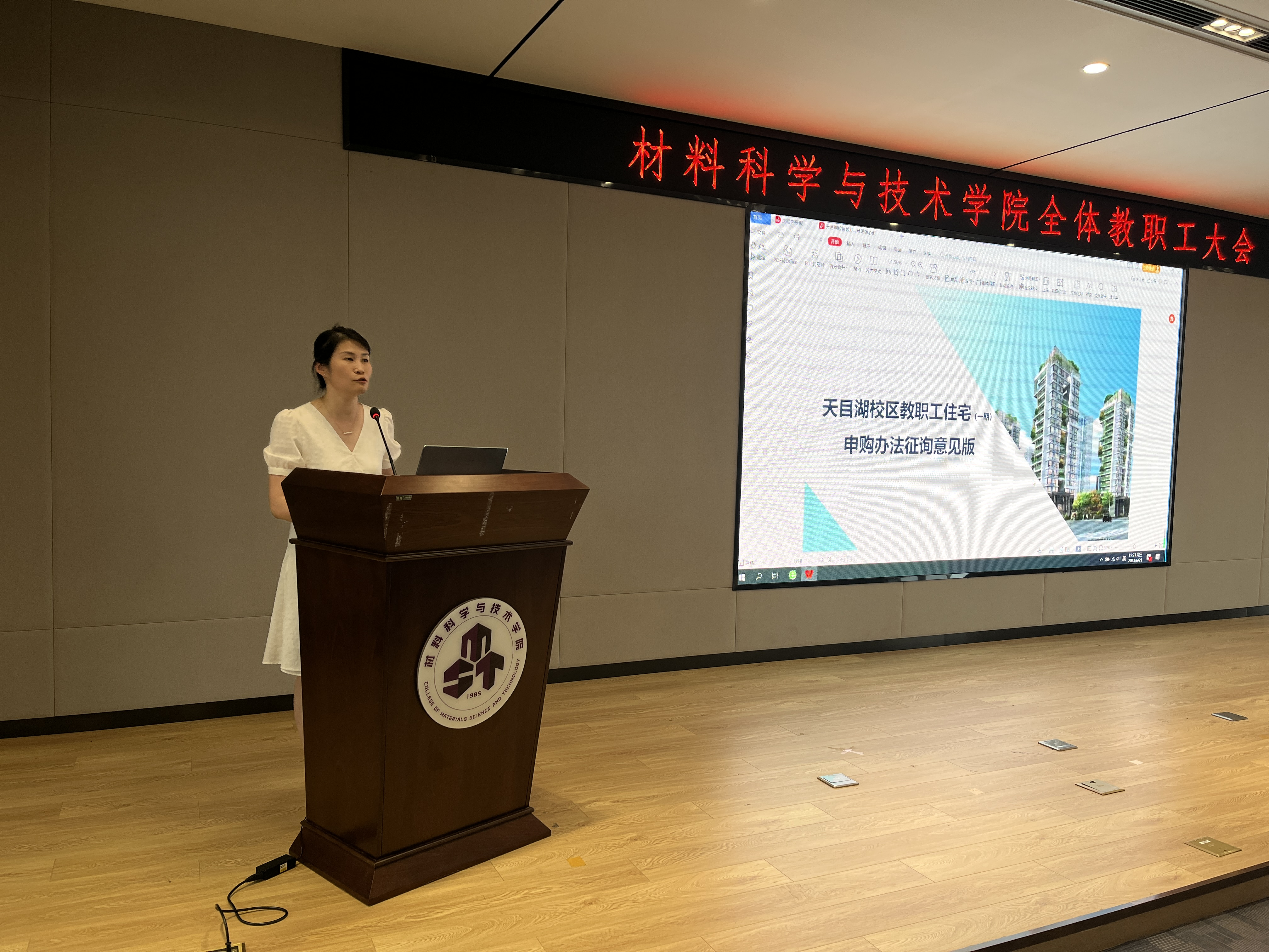 学院党委副书记、工会主席庄晓舒就学校天目湖校区教职工住宅申购方案进行宣讲,对申购流程进行详细说明。