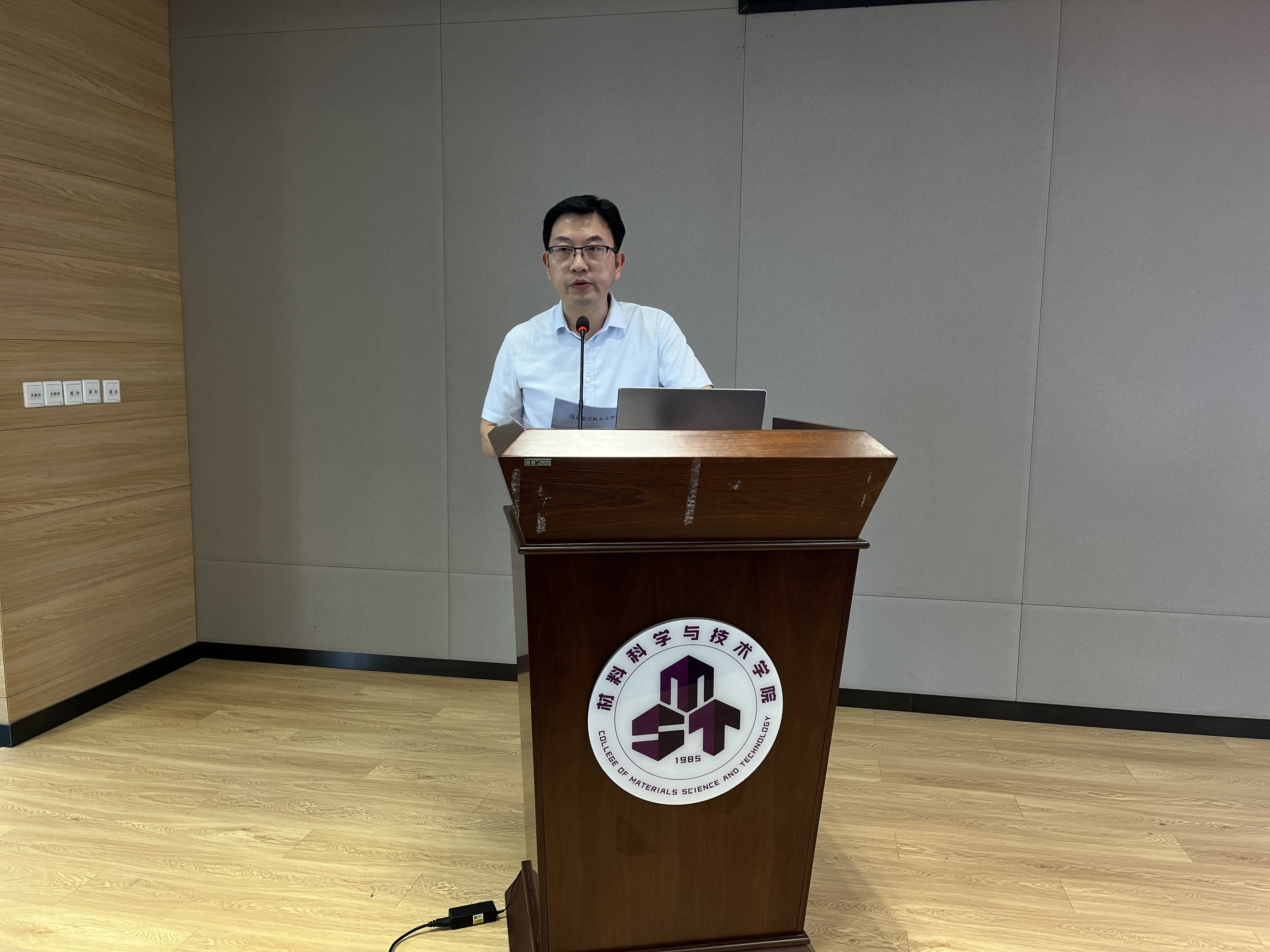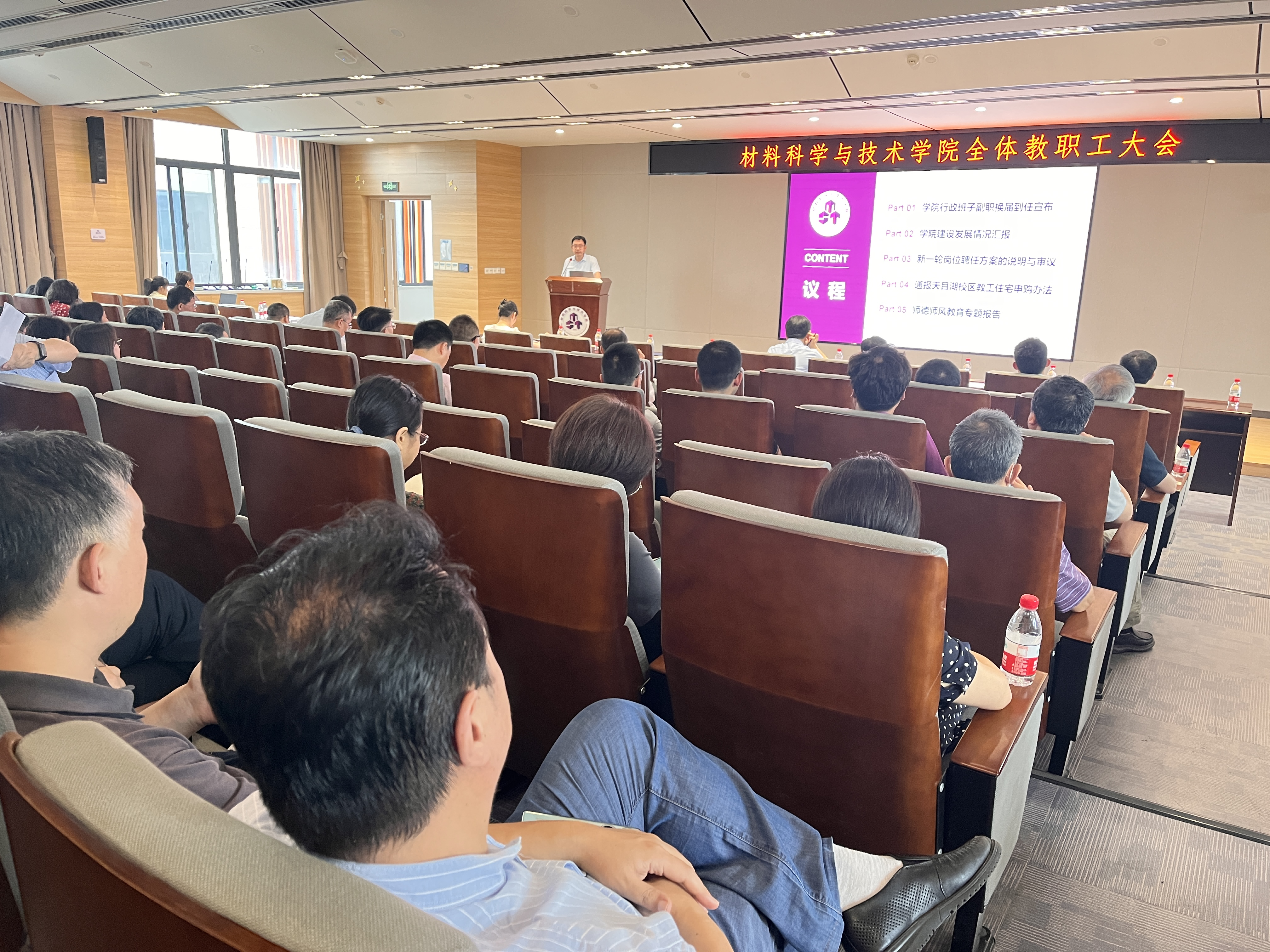 院长顾冬冬代表新一届班子作了题为“选准赛道 跨跃发展”的学院建设发展情况汇报。重点从发展现状与挑战、应对机制与举措、重点工作与规划三个方面进行介绍,进一步明确学院发展思路、凝聚发展共识。他首先对张校刚院长带领的学院上届班子为推动学院发展作出的贡献表示感谢,为学院进一步发展奠定坚实的基础。同时,他指出学院发展仍面临着对学科的“专注度”不够、对需求的“响应度”不够、对人才的“汇聚度”不够的问题和挑战。未来,学院将以讲团结、树新风、谋大事为发展理念,通过高质量党建引领、抓住学科建设牛鼻子和人才第一要素,重点推进材料学科建设“同心圆”工程、国家级重点实验室强化工程、高端人才队伍有组织培育工程、学院总体安全体系和监管能力数字化工程等五大重点工作,团结全院师生推动学院发展取得新突破。