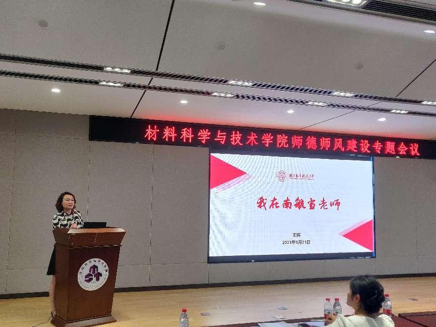 王晖以《我在南航当老师》为题,从师德师风应然状态、实然状态和必然状态三个角度对高校师德师风建设进行了分析解读,通过与老师们一起重温校庆70周年宣传视频、讲述老一辈南航人育人故事的方式,特别提到与陈达院士相处的点滴,引起大家的共鸣和回忆,让全院教师深切感受到南航文化中坚守不变的育人初心。
