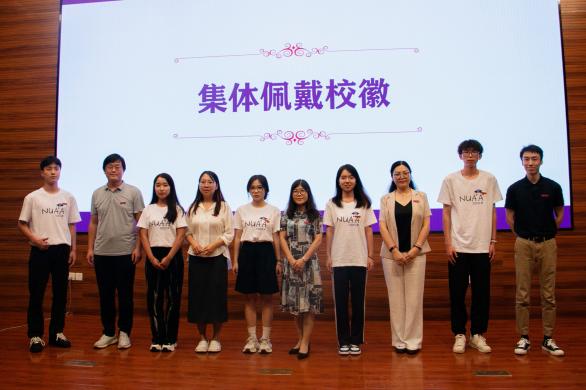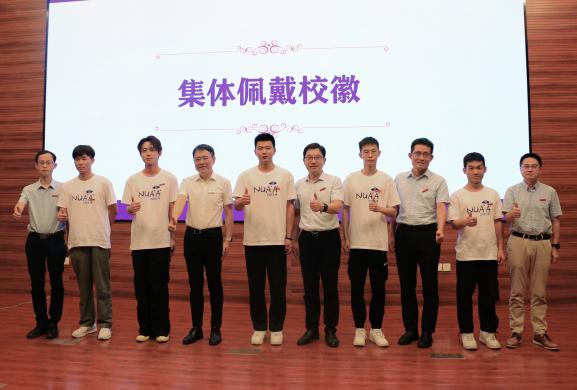 全体与会教师为2023级研究生新生代表佩戴校徽,台下全体新生共同佩戴校徽,宣告自己成为一名真正的南航人。