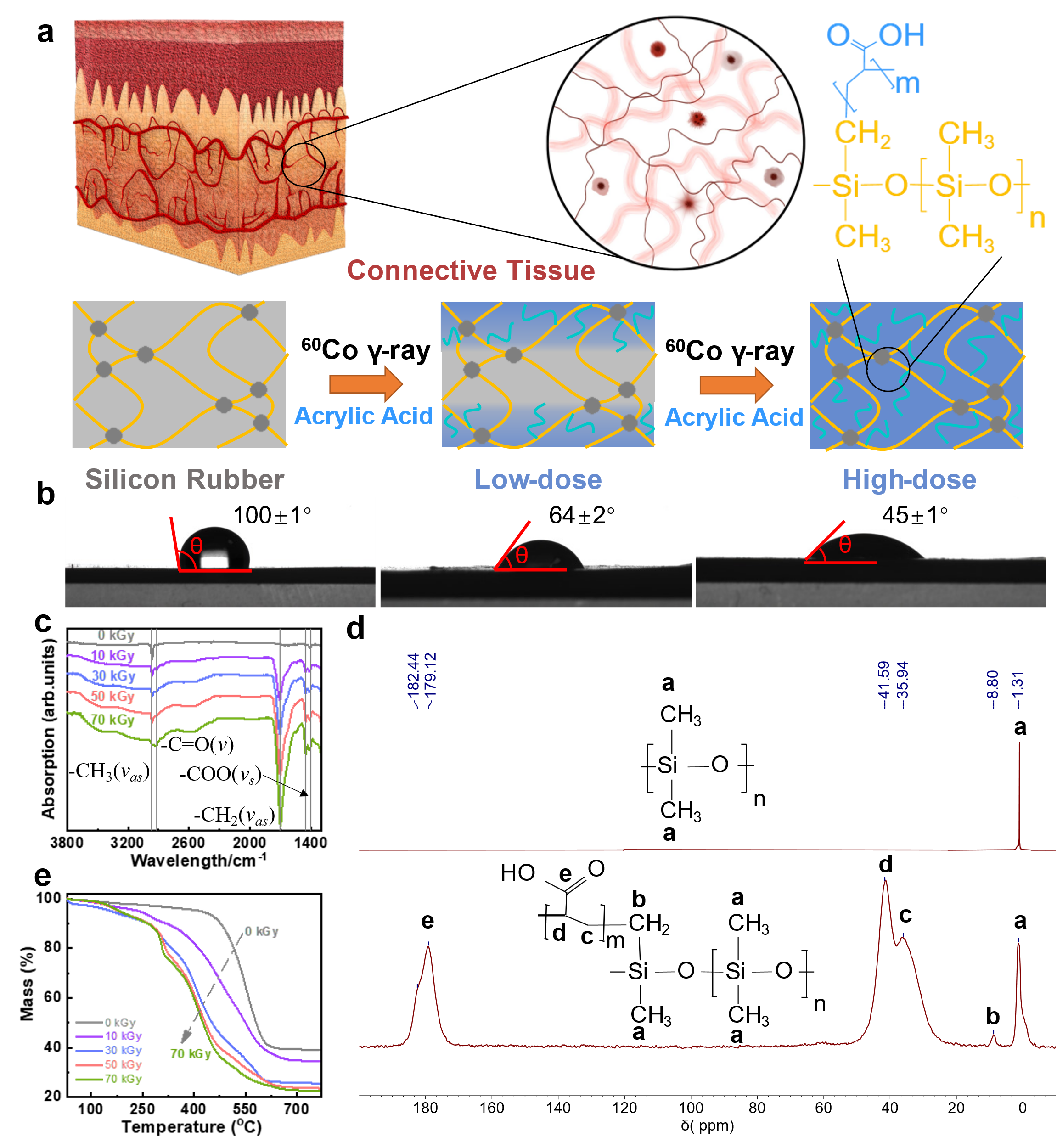 以亲水单体丙烯酸(AAc)辐射改性硅橡胶(PDMS)为例(图1a),作者通过辐射诱导,采用丙烯酸对硅橡胶进行改性,随着改性的进行,丙烯酸逐步渗透到已改性的硅橡胶层并使改性不断向硅橡胶深处进行,最终使整个硅橡胶材料均被改性成均匀的杂化水凝胶材料(CEBH)。核磁谱图证明,在辐射的作用下,AAc通过共价键作为支链接枝在PDMS交联网络上。该水凝胶以PDMS主链为骨架,提供亲水性能的AAc为支链,其结构与结缔组织中的弹性纤维与亲水性基质复合结构类似,具有良好的弹性和亲水性。