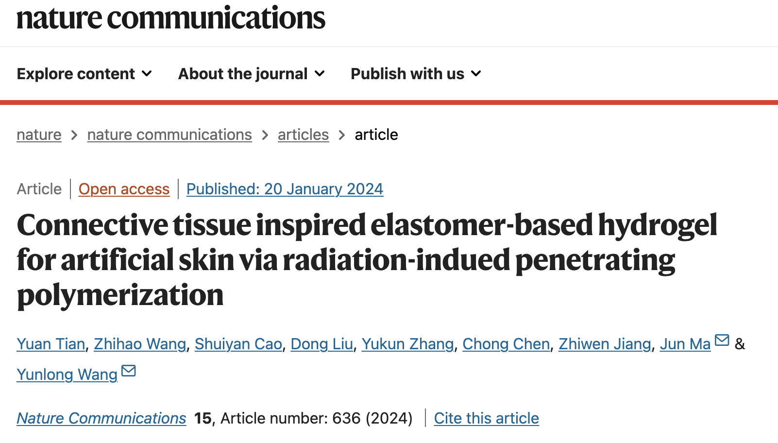 近日,电子游戏试玩-试玩游戏赚钱 讲师王运龙博士、中国科学技术大学马骏教授与中国工程物理研究院核物理与化学研究所刘栋研究员合作在Nature Communications期刊发表了一篇题为“Connective Tissue Inspired Elastomer-based Hydrogel for Artificial Skin via Radiation-indued Penetrating Polymerization”的研究论文。