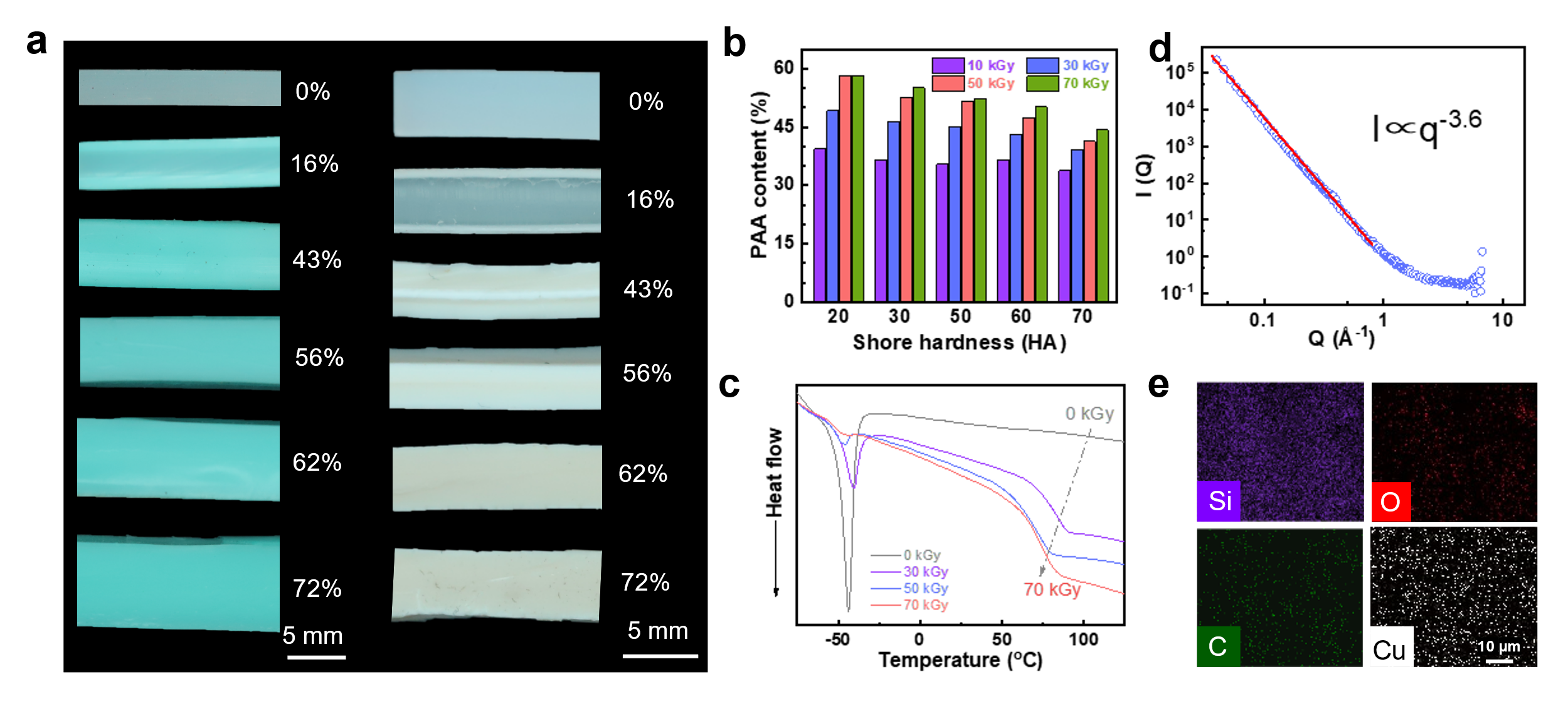如图2a展示了辐射诱导渗透接枝的接枝前沿向内部扩展,并最终形成均匀水凝胶的过程。随着接枝程度的增加,亲水层的厚度不断增长,而疏水芯层收缩并最终消失。作者通过不同硬度(即交联网络密度)的接枝发现,交联网络密度的提高会降低最终接枝率,表明交联网络提供的收缩力会抑制了改性过程中单体的渗透。进而可以推测,接枝后溶胀导致的收缩力同样会后续改性过程,并限制已接枝层的过度改性,从而使整个接枝体较为均匀而不是呈现梯度结构。DSC结果显示,在接枝过后,硅橡胶和聚丙烯酸在CEBH中均未形成连续相。而小角中子散射(SANS)谱图显示,Porod拟合结果给出的幂律斜率为-3.6,表明溶胀水凝胶中的分子链呈现出分形维数为2.4的表面分形结构,证明了氘代水溶胀的PAA和疏水PDMS的界面高度弥散。研究团队将CEBH浸入Cu2+溶液后,通过EDS映射表征元素的分布(图2e),发现CEBH中的Cu、Si、C和O元素分布表明没有畴结构的均质结构。因而,CEBH呈现出均一的相结构,排除了双连续相结构的可能性。