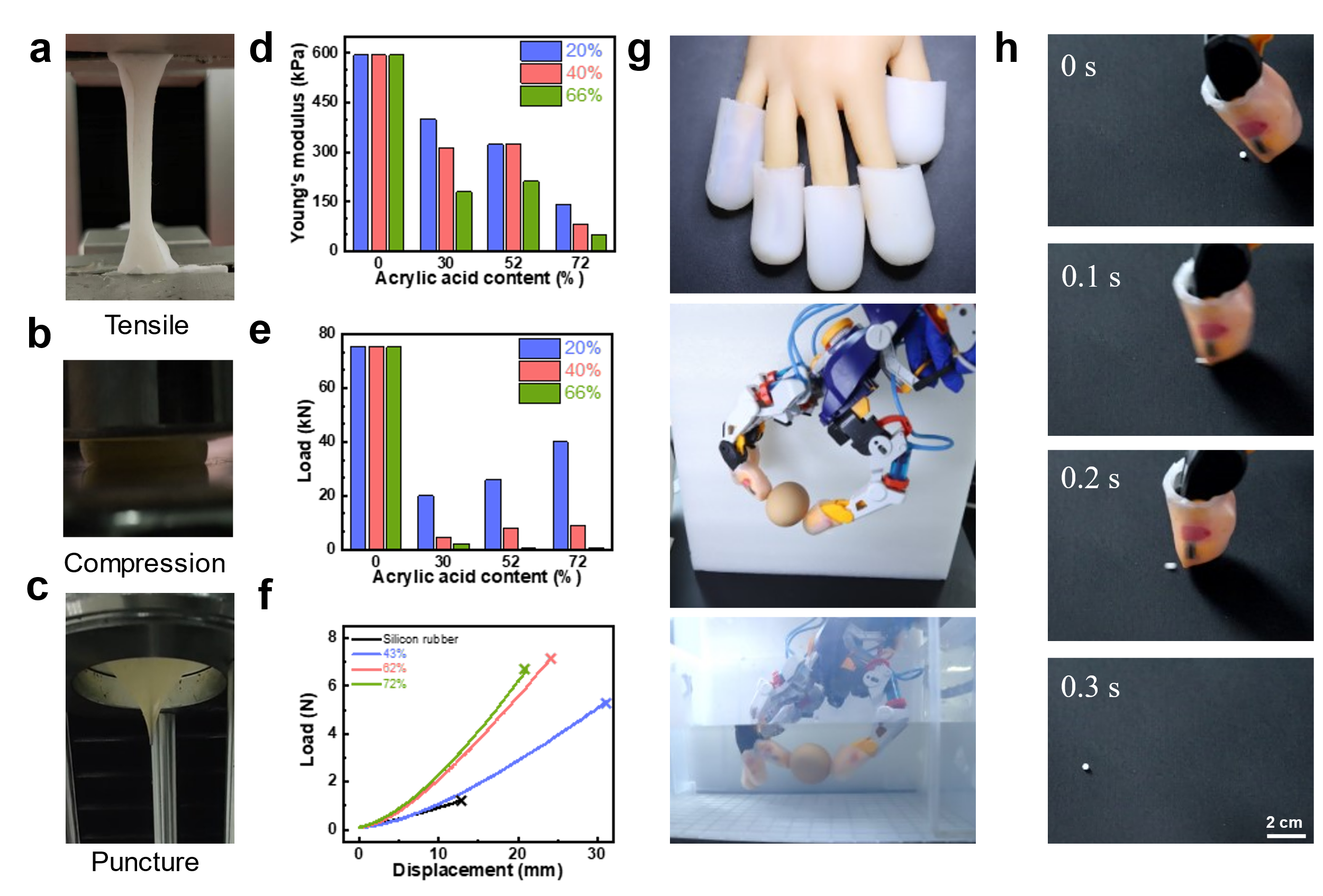 研究团队通过万能拉伸机对CEBH进行了机械性能的测试。CEBH的杨氏模量最高可达0.4 MPa,用钙离子钙化后可达3.2 MPa(图3a d)。CEBH最高可承受4吨的压力,且释放压力后可快速恢复(图3b e)。在穿刺实验中,CEBH可被顶起很高的锥形,证明其具有很好的抗穿刺能力(图3c f)。针头直径1 mm时,最大抗穿刺力为7.2 N;针头直径10 mm时,最大抗穿刺力为96 N。同时,CEBH具有相对粗糙的表面,摩擦系数最大为1.3。上述力学性能均可通过丙烯酸含量与含水量进行调节。研究团队将CEBH制备成指套形状套在机械手上,发现机械手可以轻松的在空气和水中抓起表面光滑的鸡蛋,也可以弹走泡沫小球(直径3mm)而不是黏在水凝胶上。CEBH具有的优异不粘附性、不脆性、耐高压性和抗穿刺性能,是一种性能优异的仿人类皮肤材料。