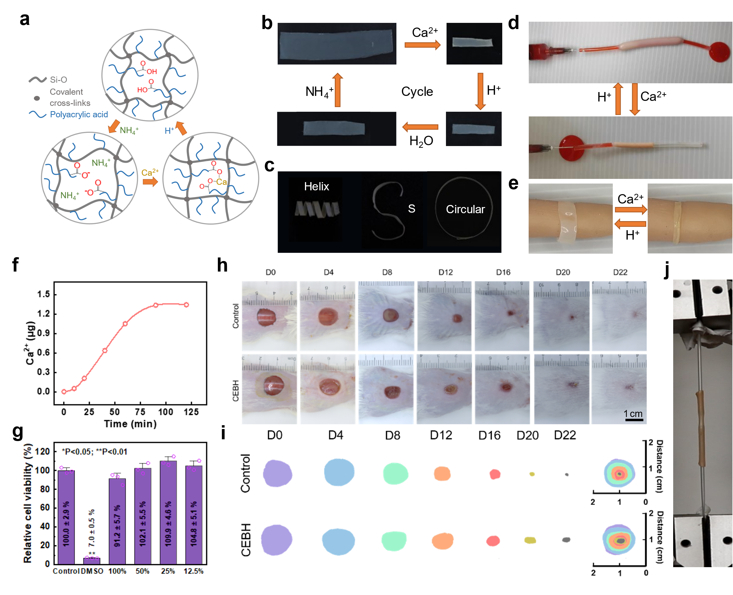 此外,研究团队还对该水凝胶的潜在应用进行了探索。形状适应是医学组织工程应用的一个关键问题。研究团队证明,具有高含量羧酸基团的 CEBH 可以在碱性溶液中膨胀,在 Ca2+溶液中固定其形状,并在弱酸溶液中恢复其原始形状(图4a-c)。因而,通过不同离子环境的改变,可以控制该水凝胶材料的形貌以适应不同的应用场景。研究人员进一步展示了通过离子环境进行液体流量控制的简单装置。在该装置中,导管的一部分被转换为CEBH,并在该部分预设了一个小的实心塑料球。通过改变装置外部的离子环境,通过CEBH管的膨胀和收缩实现了液体流动的离子触发开关。此外,细胞毒性证明该水凝胶材料具有良好的生物相容性,可应用于医疗领域。图4e描绘了伤口敷料的应用。碱化膨胀的CEBH覆盖到模拟受伤部位,喷洒钙离子溶液后,敷料在较短时间内即可收缩并符合伤口轮廓,并且可使用弱酸溶液(此处为0.2M柠檬酸)来解除收缩,从而轻松去除绷带。研究团队还用小鼠(BALB / c)进行全层皮肤伤口愈合实验。结果表明,对照组(用Tegaderm薄膜处理)和模型组(用CEBH处理)的伤口愈合率相似,伤口闭合结果无显著差异,表明CEBH与Tegaderm™™薄膜对实验小鼠伤口愈合的影响相似并显示出良好的生物安全性。另外,CEBH管的收缩力可以提供牢固的连接(图4j),提供高达16 N的拉力。因此,CEBH还具有成为手术中固定体的潜力。
