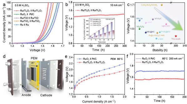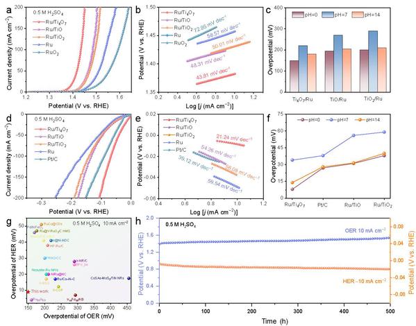 Ru/Ti4O7表现出最低的OER过电势(10 mA cm-2下为150 mV)。对于HER,Ru/Ti4O7在酸性环境中在10 mA cm-2下也表现出8 mV的超低过电势。更重要的是,在酸性环境中,Ru/Ti4O7在可维持OER与HER的500小时良好稳定性,并伴随着可忽略不计的活性衰减与轻微的结构破坏。