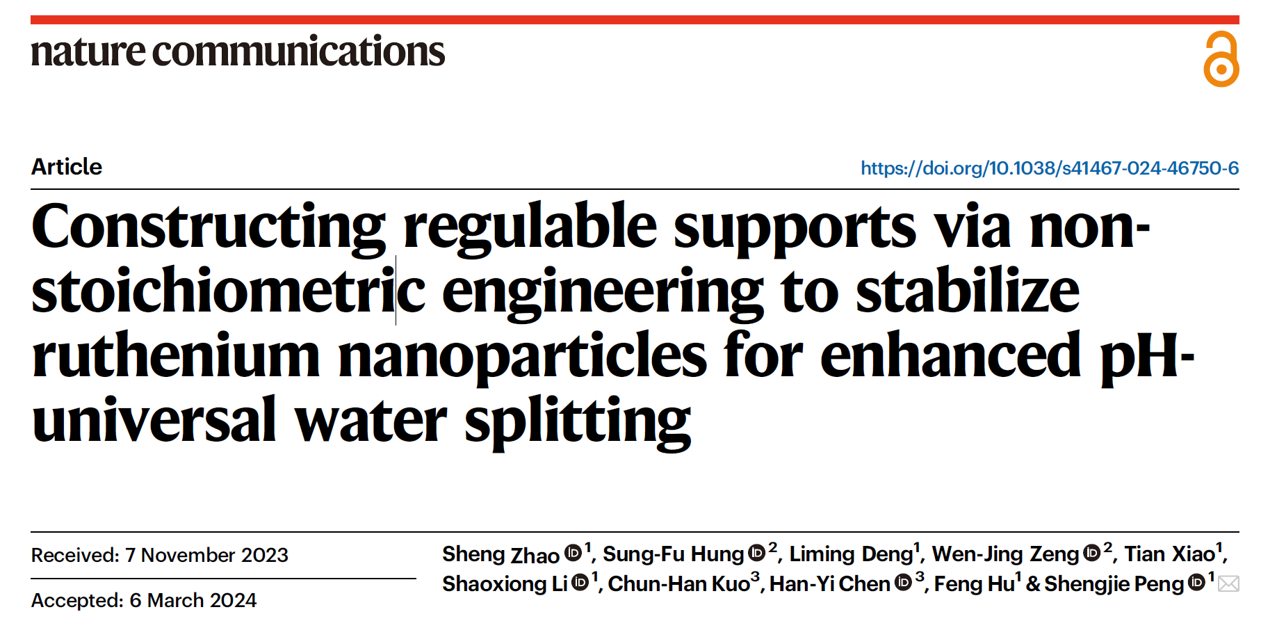近日,电子游戏试玩 电催化与清洁能源团队彭生杰教授Nature Communications期刊发表了一篇题为“Constructing regulable supports via non-stoichiometric engineering to stabilize ruthenium nanoparticles for enhanced pH-universal water splitting”的研究论文,论文第一作者为电子游戏试玩 博士生赵晟,彭生杰教授为通讯作者。