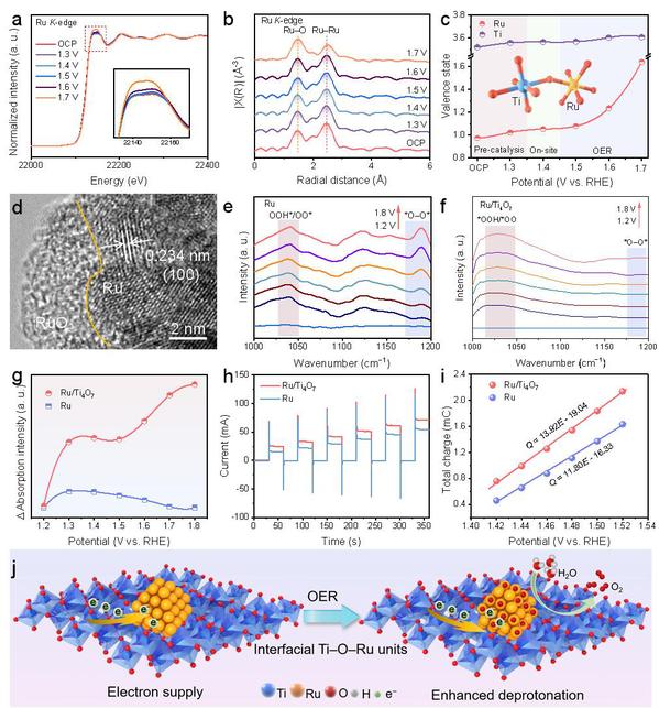 研究团队通过一系列原位测试揭示了Ru/Ti4O7的OER过程的结构演变与反应机理。即使在OER的高电势下,Ru纳米颗粒在表面形成非晶氧化物层,但内部仍然可维持金属结构。Ru/Ti4O7倾向于通过吸附演化机制驱动OER,与具有潜在催化剂溶解作用的LOM相比,可以实现更稳定的OER。