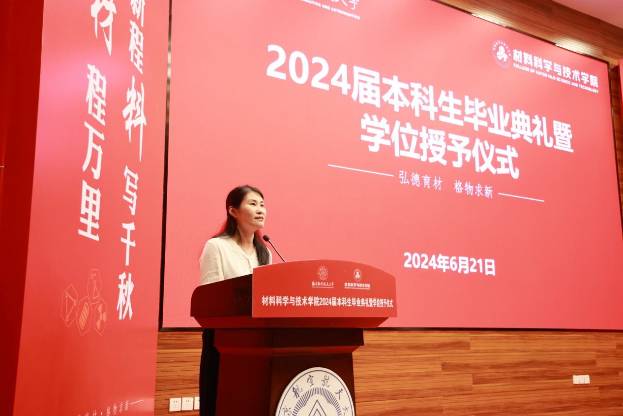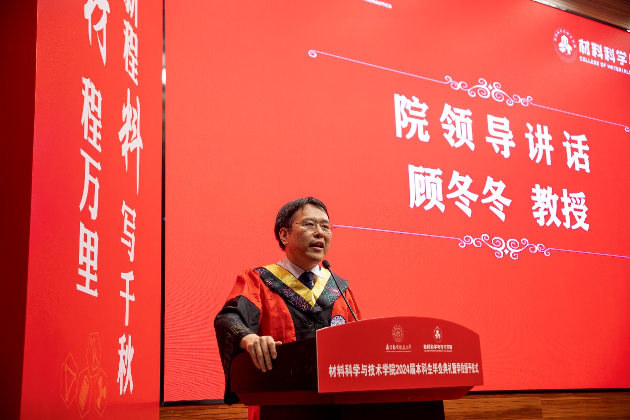 院长顾冬冬教授代表学院致辞。他首先向全体毕业生表示热烈祝贺,四年来,材料学子心怀梦想,与学院携手同行,在一步步努力中成为更好的自己。他表示毕业生们第一要感谢国家,感谢国家对高等教育的重视和支持,为大家提供了优质的学习资源和良好的学习环境;第二要感谢学校,学校的培养和教育使毕业生们更加成熟和自信,为未来的道路奠定了坚实的基础;第三要感谢父母,父母是你们的坚强后盾,他们默默付出、无私奉献,为你们提供了温暖的家庭和无尽的爱。最后,他希望同学们未来像黄金一样闪闪发光、像钻石一样熠熠生辉,在未来的道路上能够继续保持对生活的热爱和追求,为社会的发展贡献自己的力量。