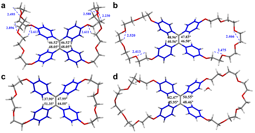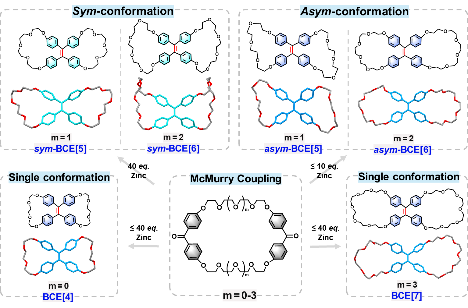 BCE[n](n = 4-7)蝶冠醚通过巧妙的分子内McMurry反应得到,结果显示:在不同当量锌粉下,产物的核磁谱图和晶体结构均存在明显差异。在10当量锌粉条件下得到的蓝色产物晶体结构为一种不对称的蝴蝶形构象(asym-BCE[5]);然而,在40当量锌粉条件下得到的另一种蓝绿色产物晶体结构为高度对称的蝴蝶形构象(sym-BCE[5])。