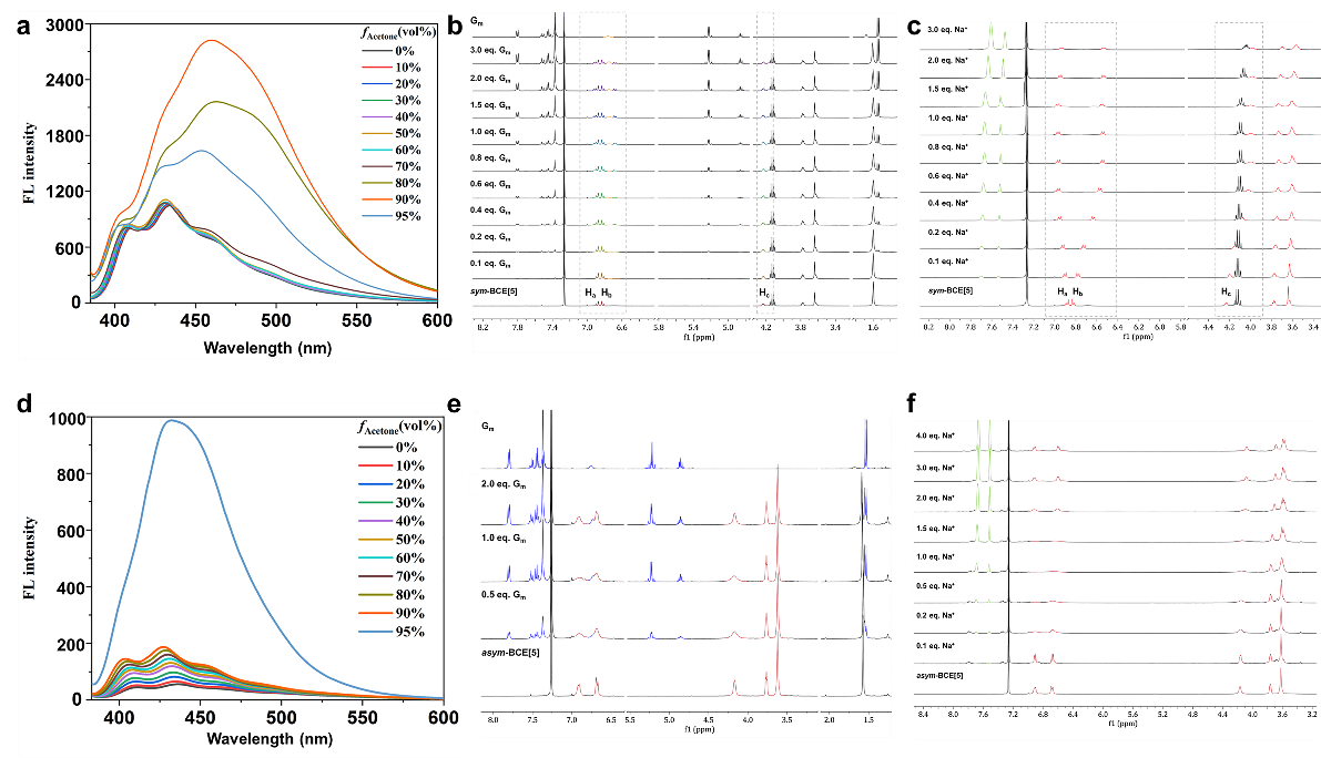 鉴于此,南京航空航天大学胡晓玉教授团队设计合成了一系列内核TPE嵌入式冠醚双环分子,并命名为蝶冠醚BCE[n](n=4-7)。在制备过程中惊奇地发现,半刚性结构的蝶冠醚中存在两种稳定的构象异构体(对称型sym-BCE[n]和不对称型asym-BCE[n],n = 5, 6);而具有刚性结构的BCE[4]和柔性结构的BCE[7]只存在单一的构象异构体,且这两种异构体在荧光特性和主客体络合性质方面表现出显著差异。进一步利用超分子手性传递策略,成功构建了具有圆二色(CD)和圆偏振发光(CPL)信号的组装体,并且Na+的加入能够有效关闭该系统的手性信号,研究结果为智能手性发光材料的开发提供了新思路。