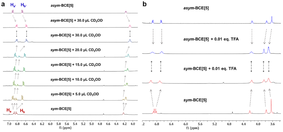 对BCE[5]分子构象异构体的转化进行研究,发现甲醇(CD3OD)和三氟乙酸(TFA)可以破坏分子内存在的弱相互作用,并实现sym-BCE[5]向asym-BCE[5]的转化。
