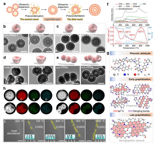 将前一轮得到的产物作为种子,为随后生长得到的酚醛提供生长位点。结合 Layer-By-Layer 过程实现多种动力学的自由叠加,并构建一系列多壳结构。而后对酚醛进行碳化,得到继承前体结构、结晶性可控的非晶碳样品。