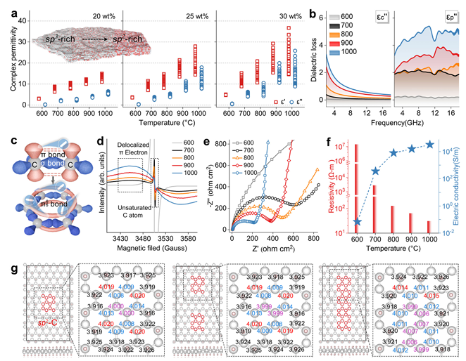 1)sp2/sp3杂化原子结构中离散、丰富的sp2域是介电特性的最初起源,与后续形态调制的有效性密切相关。原子构型决定的介电特性在结构调制过程中会累积多次,并最终传递到整体性能中。