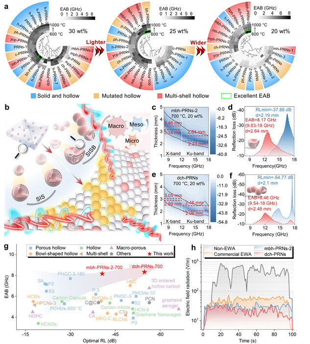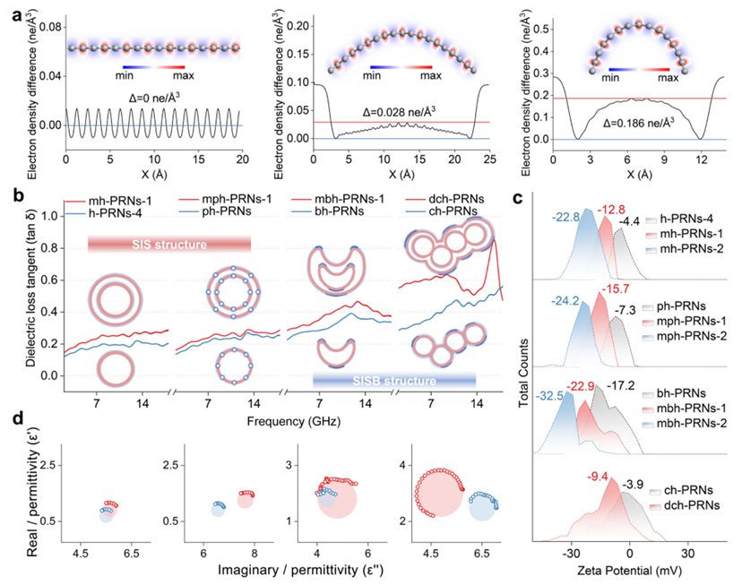 2)大区率纳米表面以及多壳的非对称结构逐步放大了整体极化。多个尺度上累积的电荷不平衡结合在一起,产生了联锁和跨尺度介电损耗的集体行为,从而使非晶系统能够高效运行并耗尽电磁波。