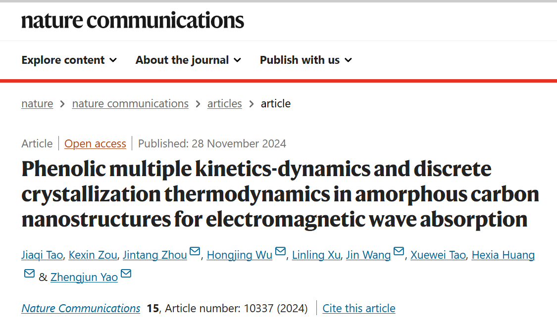 近日,电子游戏试玩 姚正军教授、周金堂副教授在《Nature Communications》期刊发表了题为“Phenolic multiple kinetics-dynamics and discrete crystallization thermodynamics in amorphous carbon nanostructures for electromagnetic wave absorption”的研究论文,博士生陶佳麒为第一作者,姚正军教授和周金堂副教授为第一单位通讯作者。