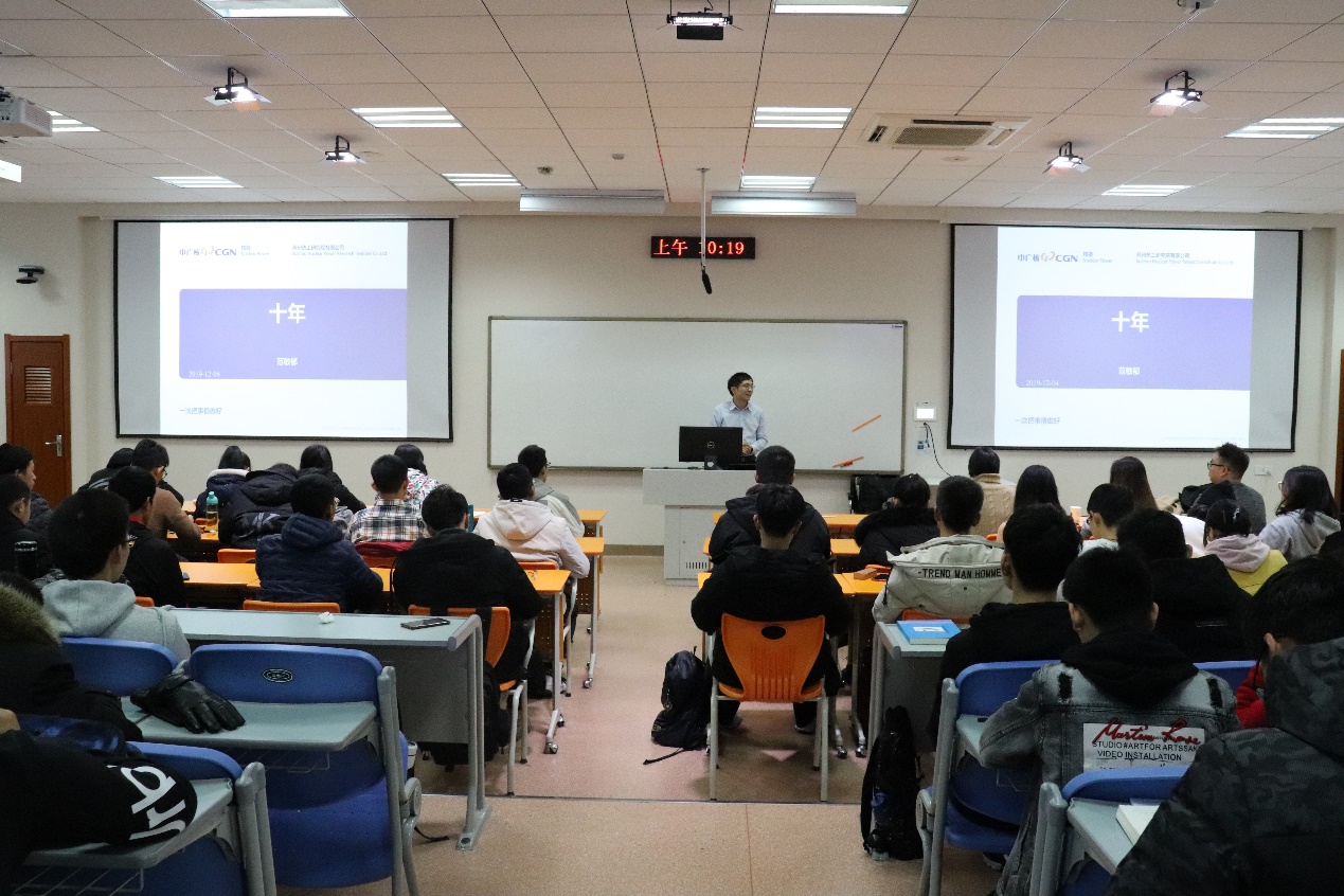 随后范敏郁向大家介绍了中国核电行业的现状和发展前景,从区域分布、市场份额,先进技术和国际化等方面全方位地位同学们做了解析,并通过自己三年来的工作经历为同学们分享了核电行业的就业情况,并鼓励同学们认真学好专业知识,效力于清洁能源事业。
