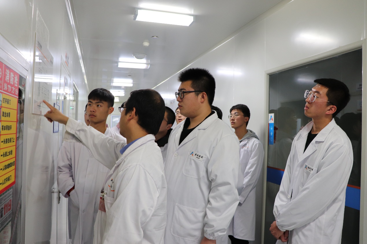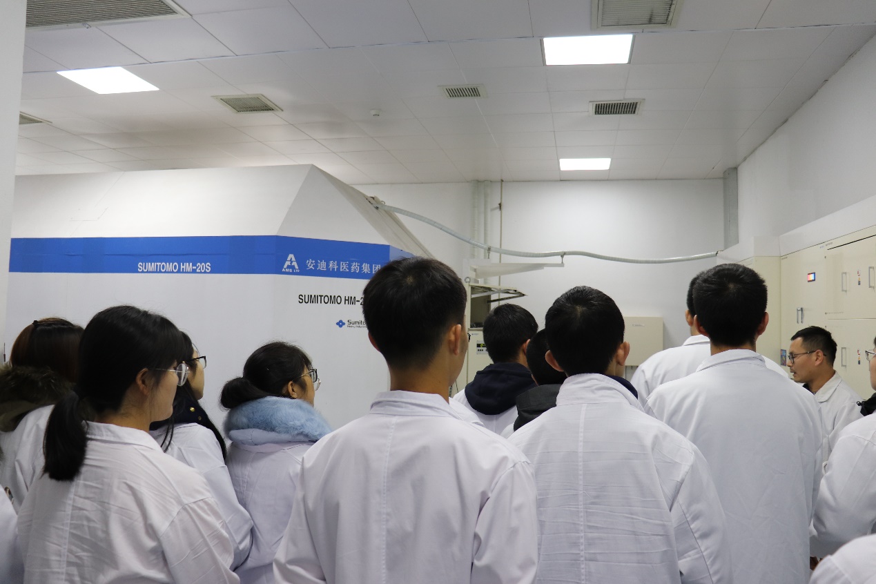 东诚药业覆盖生化原料药、中成药、化药、核药四大领域,是融药品研发、生产、销售于一体的大型制药企业集团。研发总监李世红和生产经理殷进进热情接待了师生,对厂区整体规划进行细致的介绍,带领师生逐一参观加速器控制室、质检生产区的车间、理化检验区、研发实验室并简单介绍工作原理。