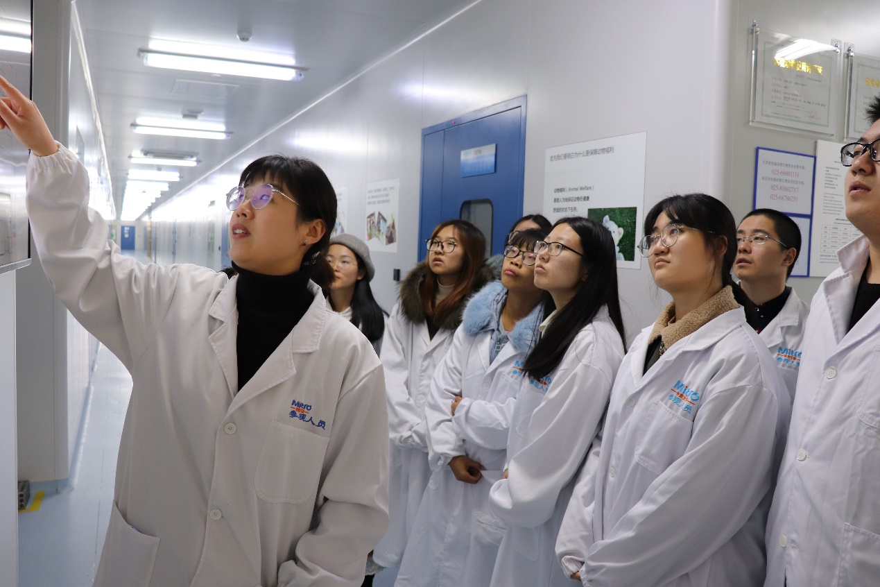 米度(南京)生物技术有限公司是国内首家分子影像医药研发外包企业。公司业务贯穿从裸(小)鼠、大鼠、猴子到人体的转化研究,重点针对肿瘤、冠心病、老年痴呆、帕金森、癫痫、风湿免疫、糖尿病等重大疾病进行研究。市场销售总监王璞重点介绍了公司实验室平面图和特色业务,带领师生参观影像实验室,对同学们的提问进行详细解答。