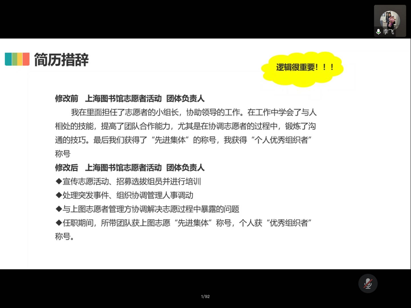 随后,马倩倩从HR的视角出发,从简历照片、简历框架、简历措辞、简历内容、简历投递等一系列细节着手,对同学们进行了详细指导。同时结合自身多年校招的工作经验,分享了很多在实际招聘中的典型案例,帮助同学们更生动地体会到在简历制作中要努力的方向和避开的误区。