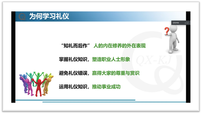 首先,李栋梁对职场礼仪的由来、重要性做了详细介绍,并对“第一印象”做了着重解读,同时以情景再现、提问互动等方式让同学们体会到职场礼仪的注意要点。
